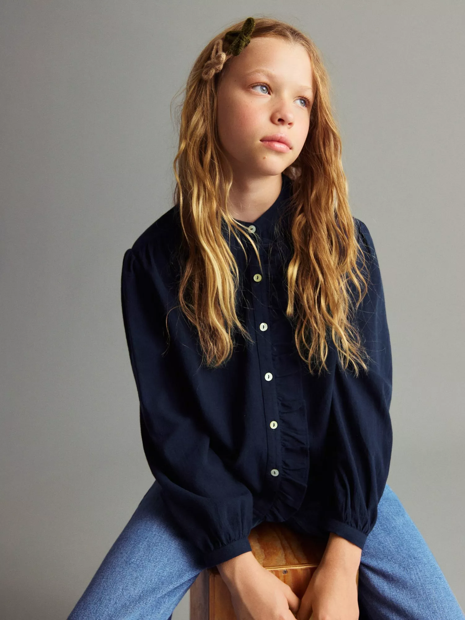 This chic, straight-cut shirt is made from soft 100% cotton. It features a classic round neckline, a stylish ruffle design down the front, and a button-up closure. Finished with long sleeves and neat buttoned cuffs for a polished look.
