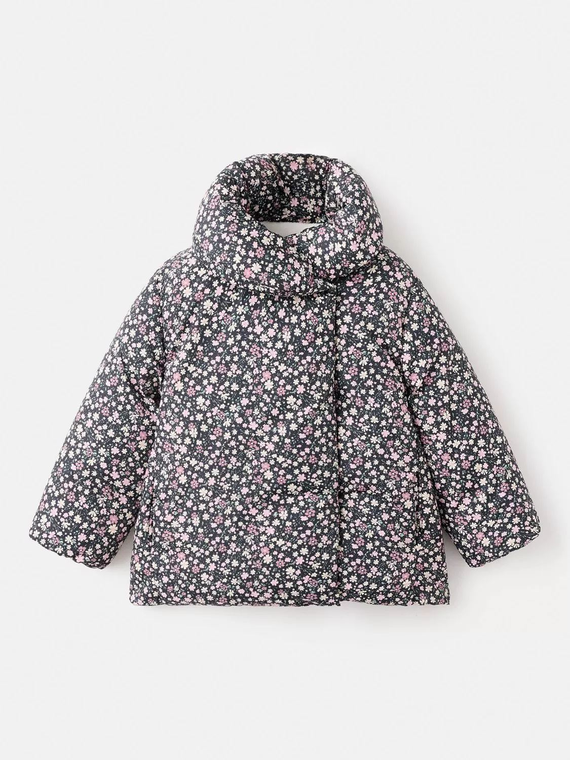 Decorated with a charming floral print, this cosy quilted coat features a high collar for added warmth, side pockets, and zip and press-stud fastenings to keep little ones secure.