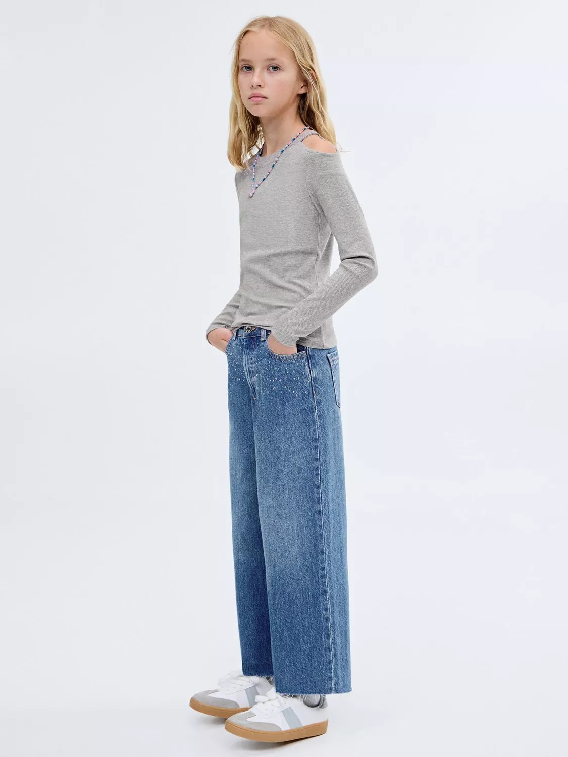100% cotton fabric in a wide leg design with regular waist, belt loops and zip and button fastening.