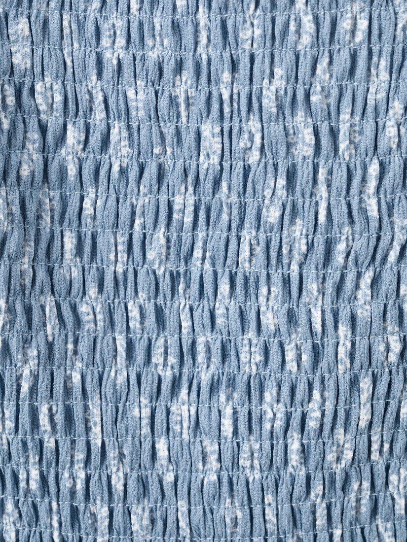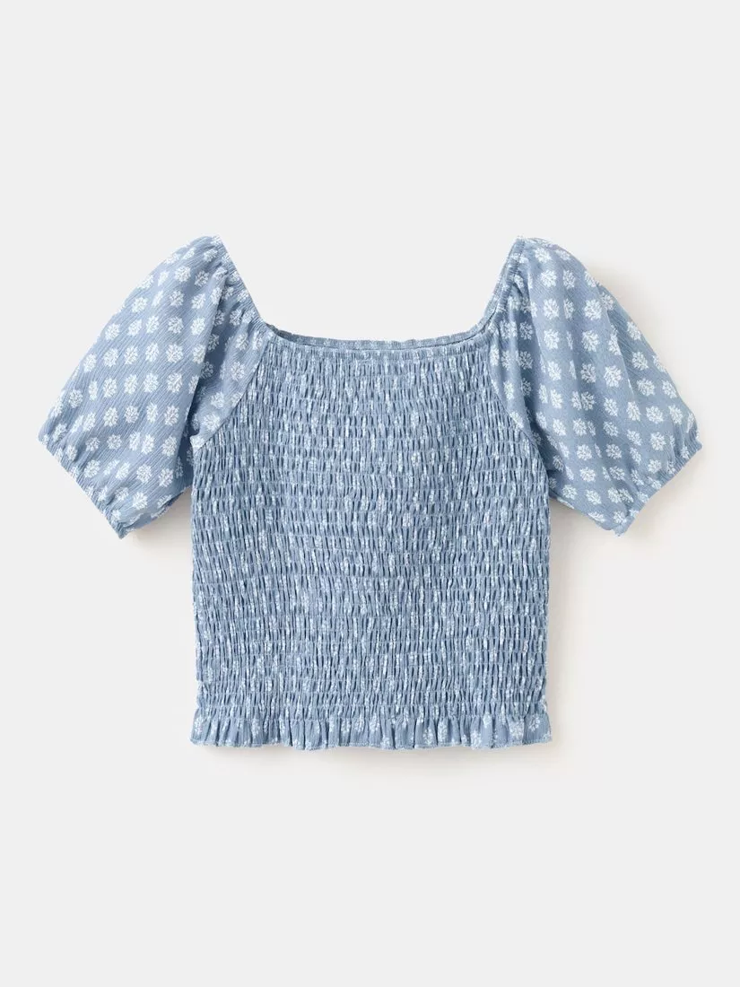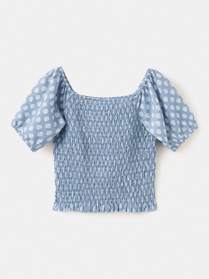 This smocked blouse features billowy sleeves and a floral pattern, offering a comfortable fit and a modern look for everyday adventures.