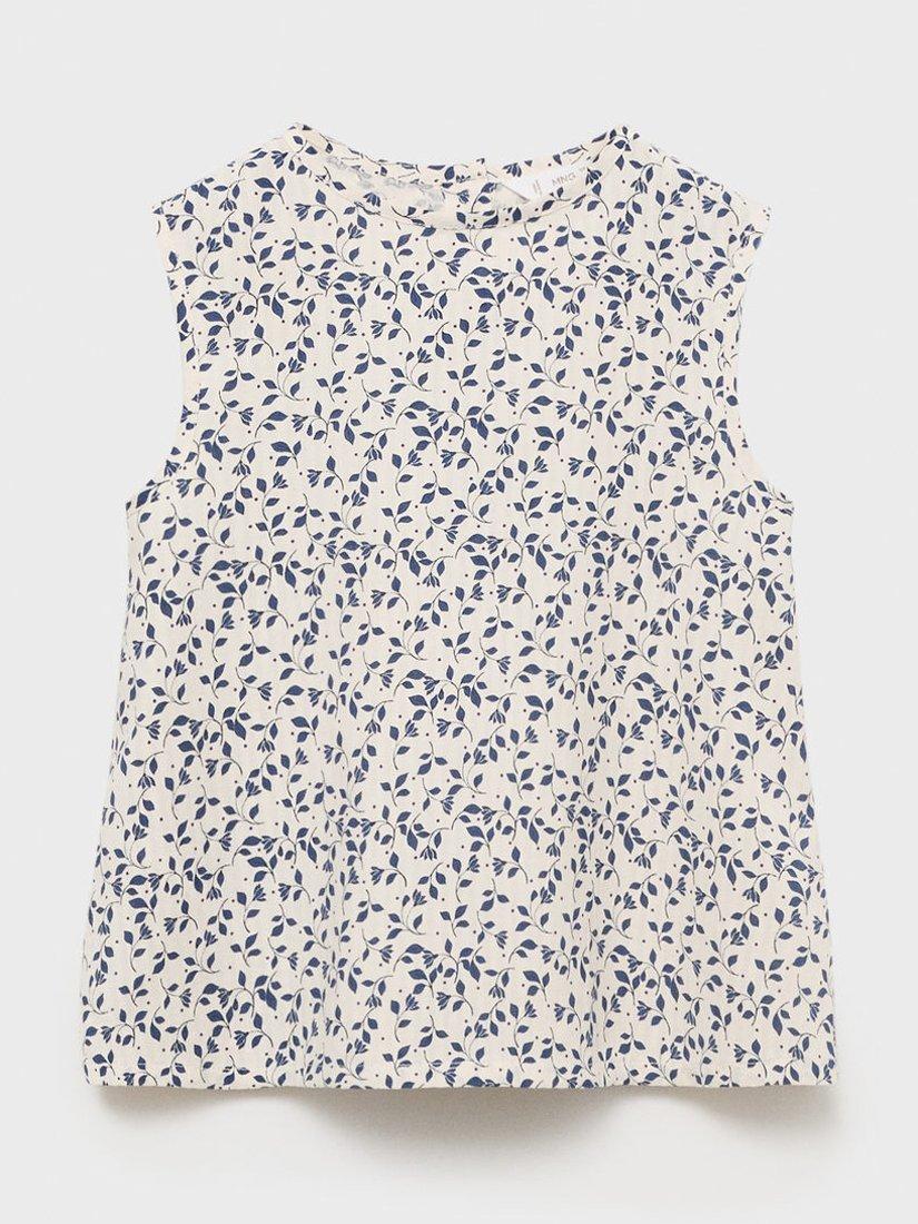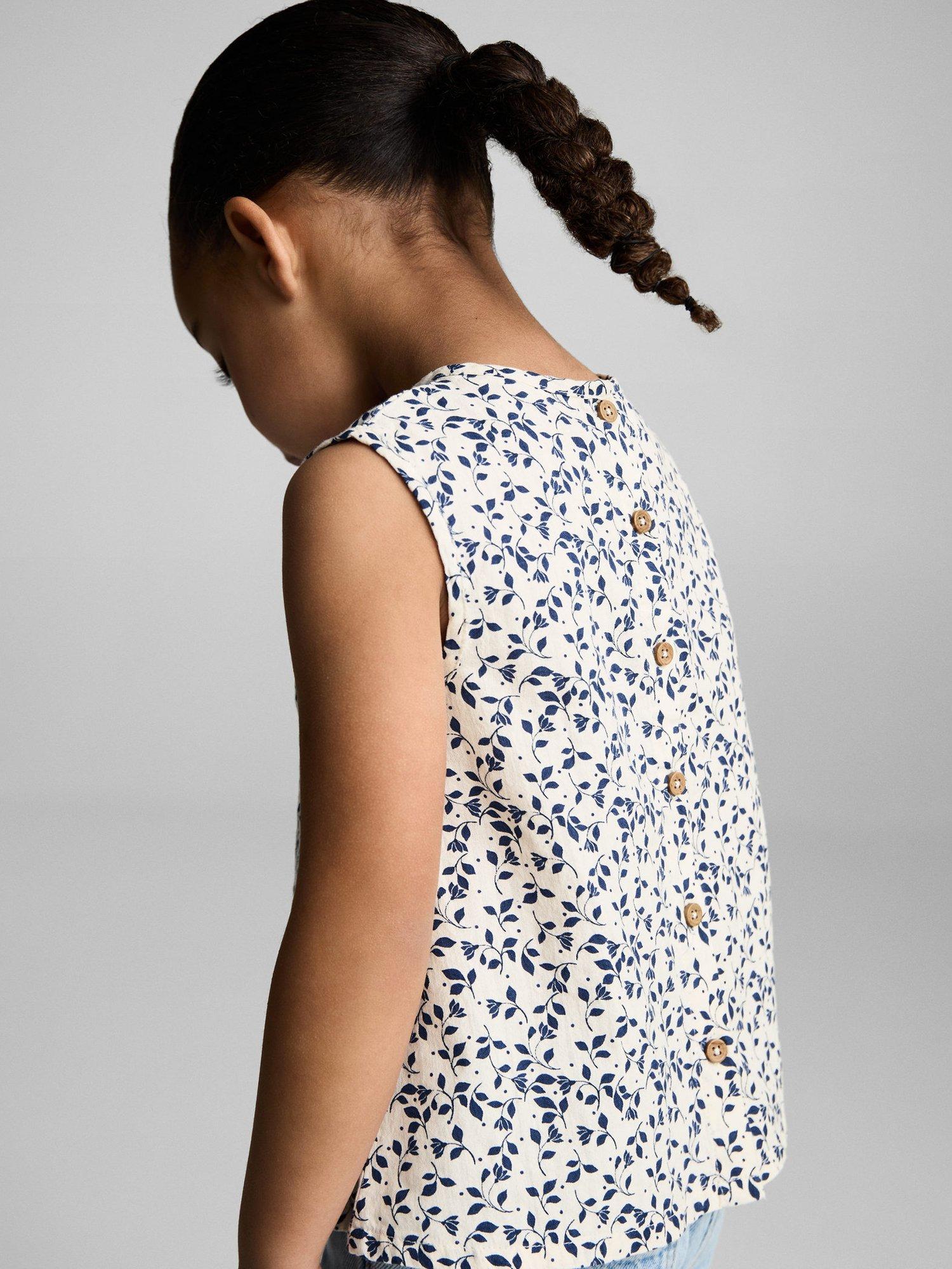 Sleevless cotton blouse with a printed leaf trellis design and wood effect buttons.