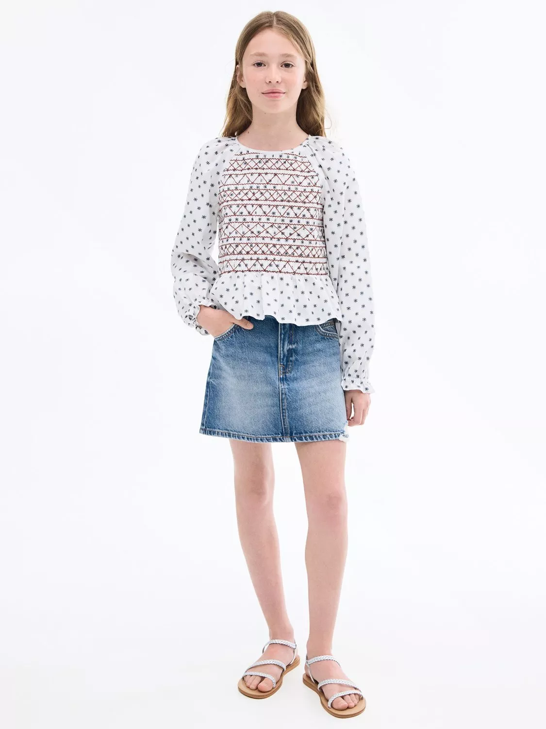 This mini A-line denim skirt offers comfort for active days, with easy movement and a versatile style suited for everyday adventures.