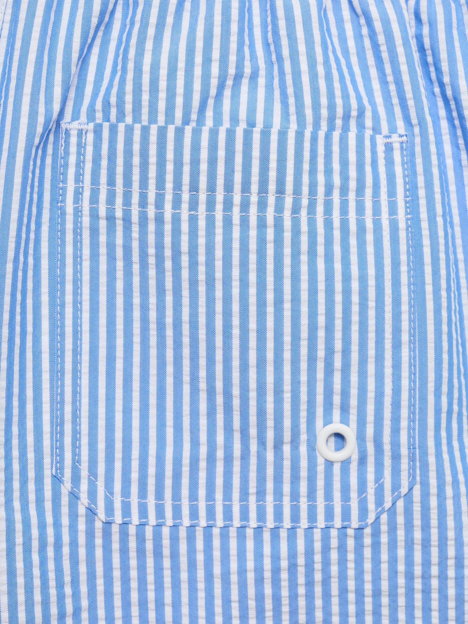 Cotton blend, seersucker fabric swim shorts, cut in a straight design with an elasticated drawstring waist and back patch pocket.