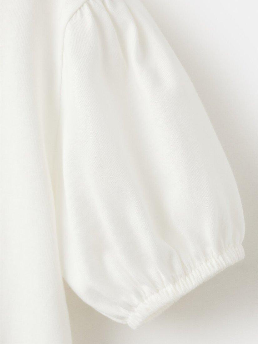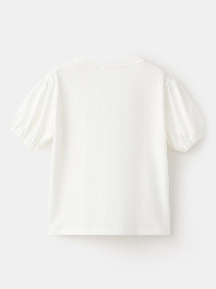 This soft cotton T-shirt features textured embroidery and playful puff sleeves, perfect for keeping kids comfortable and stylish.