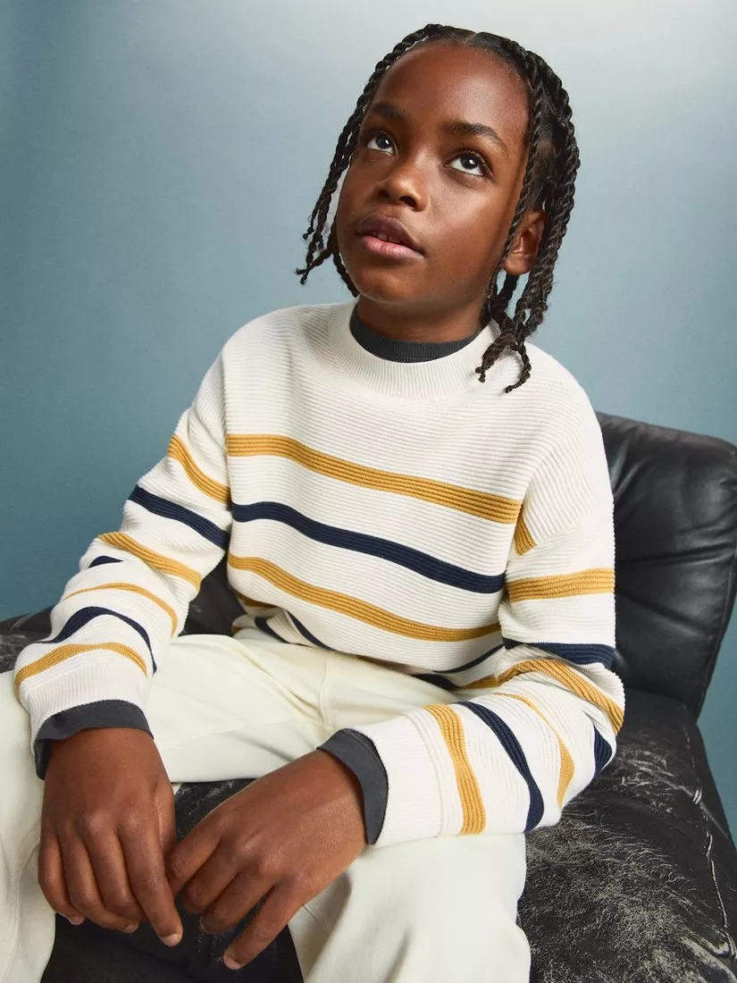 This long-sleeve jumper features a round neck and textured striped pattern, offering comfort and an easy fit for active kids in everyday settings.