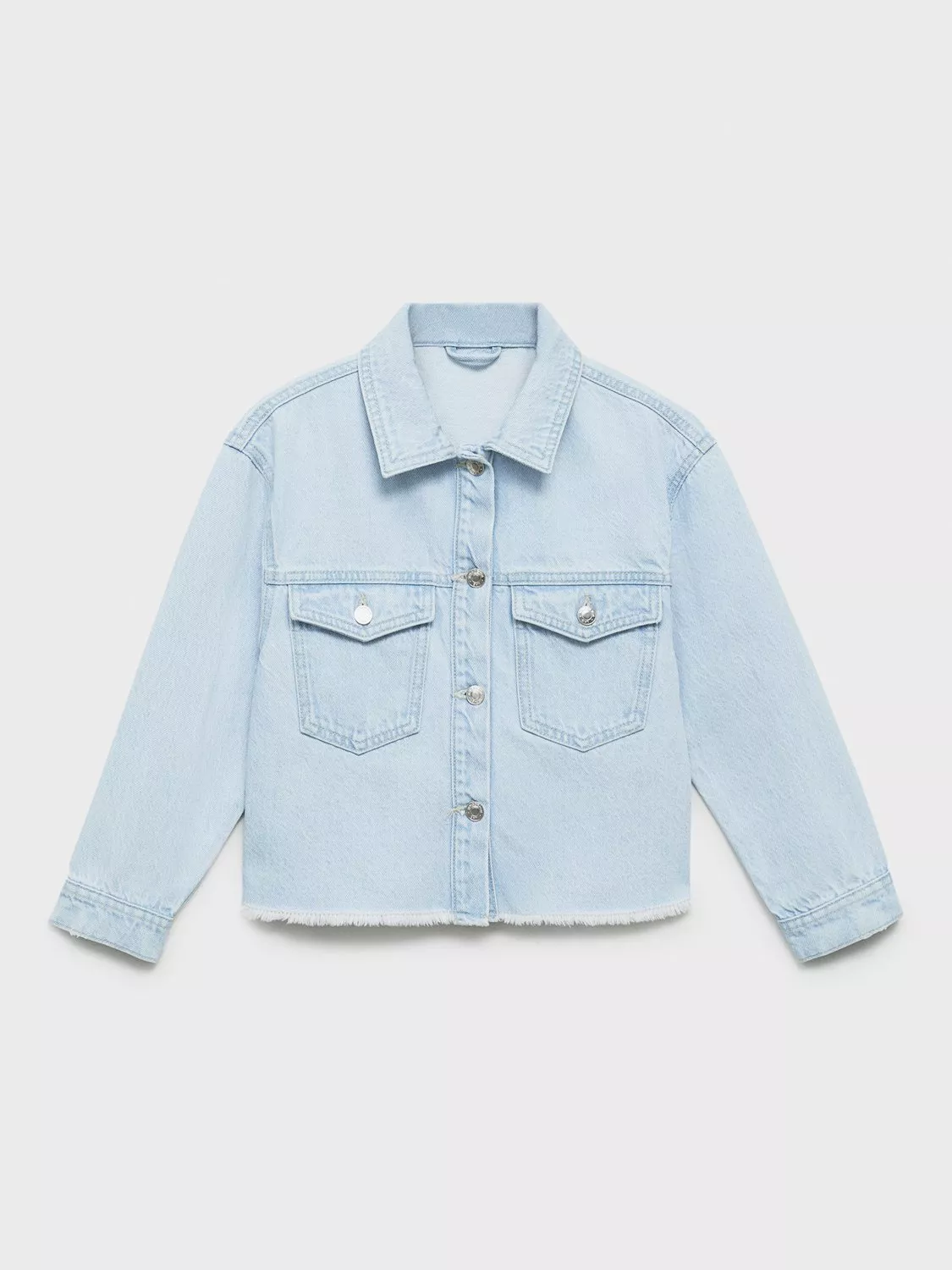 The perfect accent to their casual looks, this denim jacket from Mango comes in a cotton fabric with two-buttoned flap chest pockets and frayed hem.