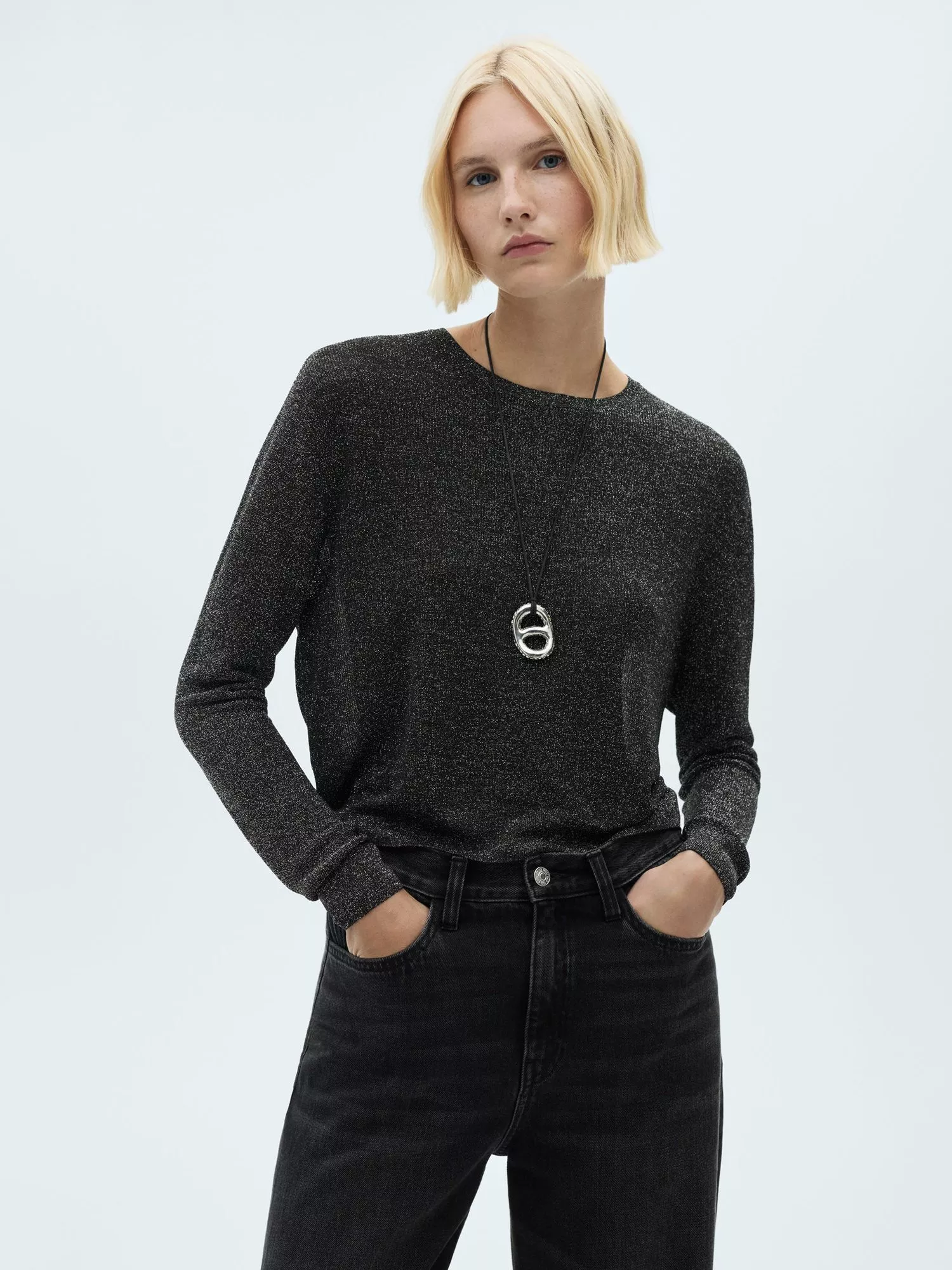 With a round neckline, this fine knit jumper from Mango is made from a metallic imbued fabric adding effortless sparkle to your looks.