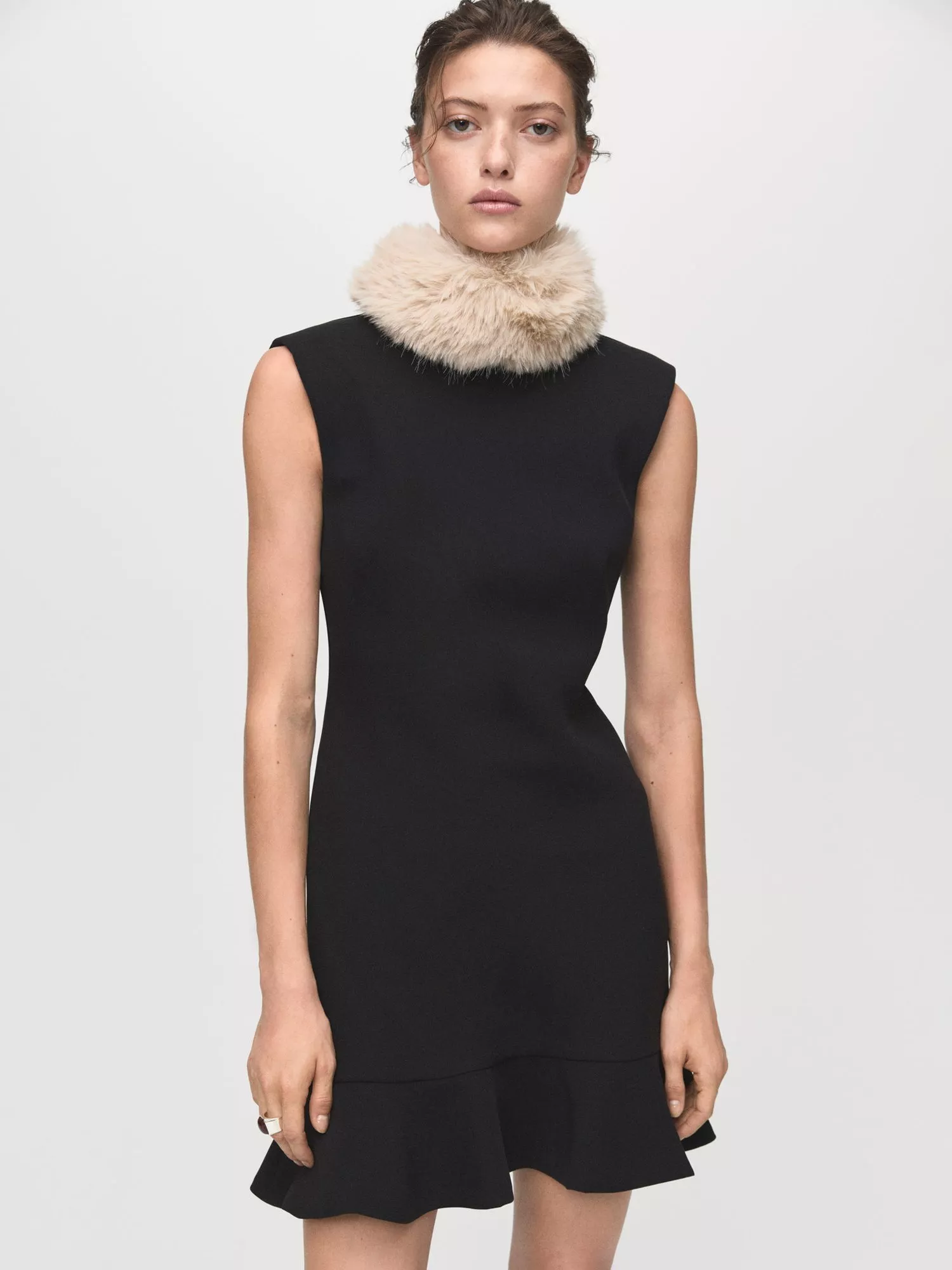 Feel ready for any celebration in this sleek ruffle hem mini sheath dress. Its high neck, shoulder pads and sleeveless style offer you modern confidence, while the lined design ensures comfort.