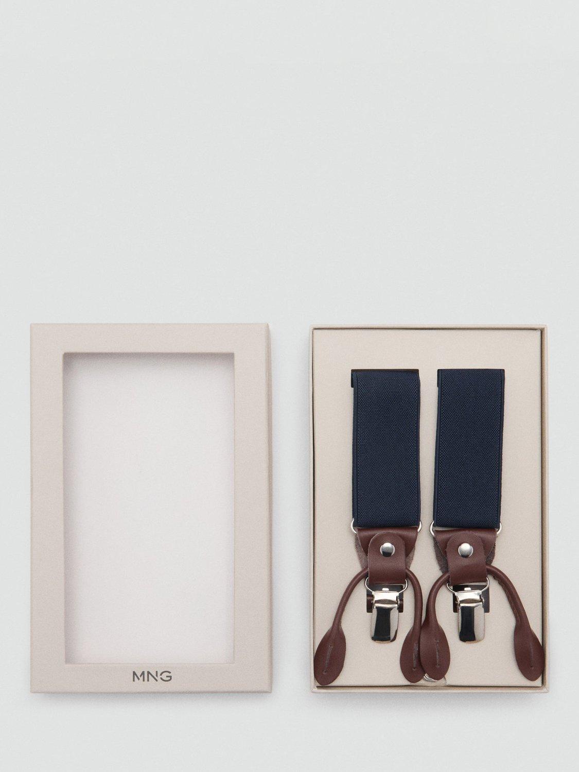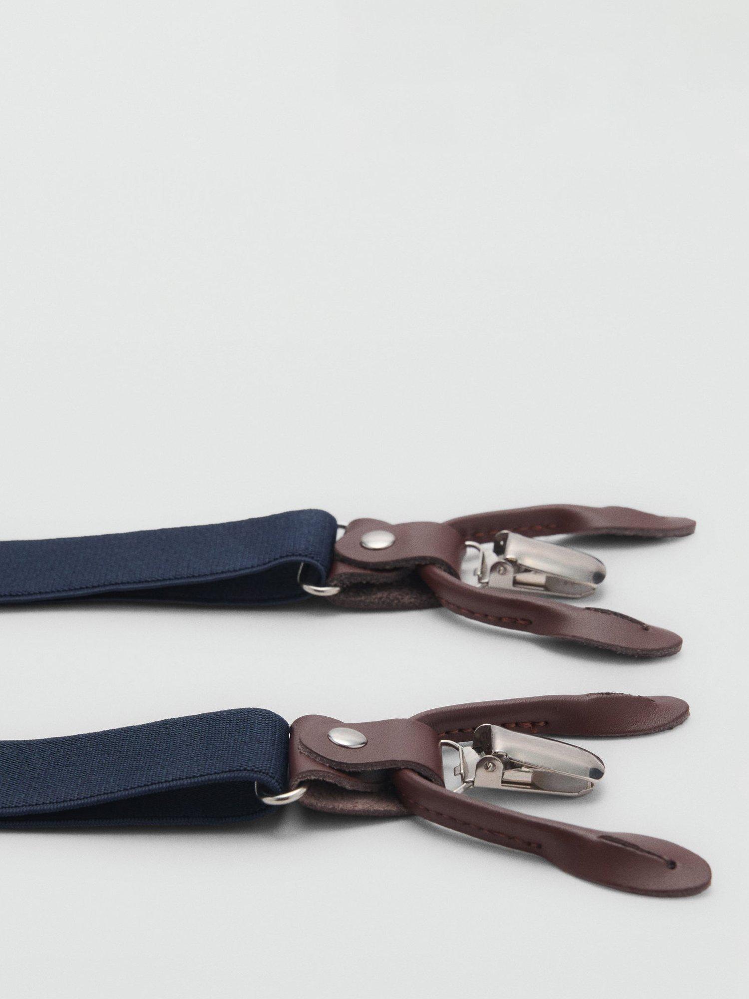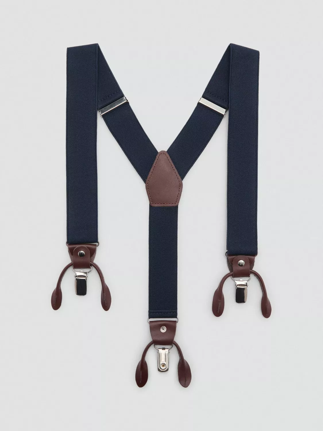 Braces with adjustable elastic straps, leather details and metal clip hooks and button sticks. Come presented in a box.