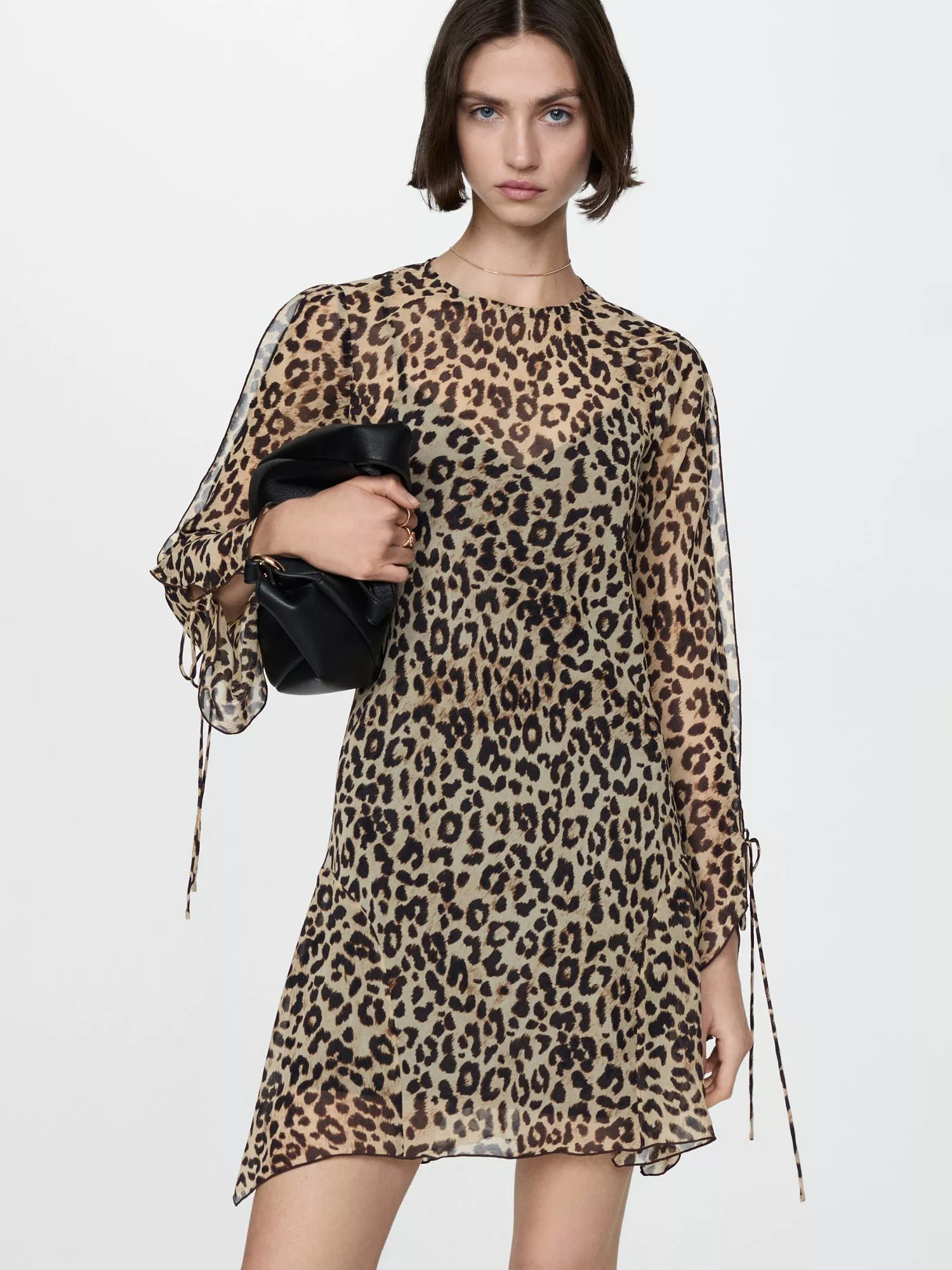 Cut to a straight shape made from a floaty fabric, this thigh-grazing dress from Mango features a simple round neck, full-length sleeves and is covered in a wild animal print.