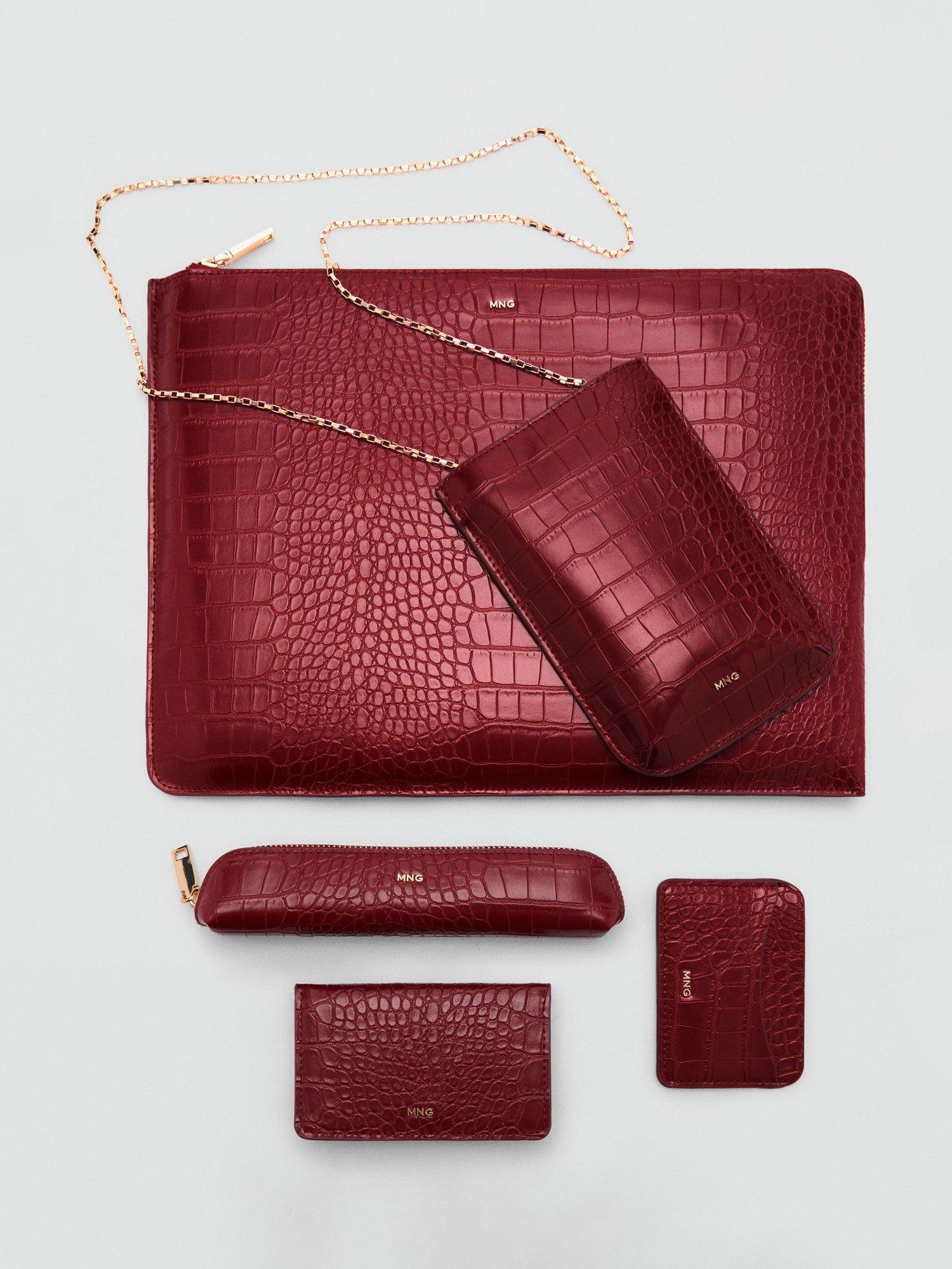 Carry your cards and cash in style with the Leonor wallet from Mango. Made from faux leather with a smart croc-effect finish, it has a single press-stud fastening, inner pocket, multiple card slots and is finished with a branded logo.