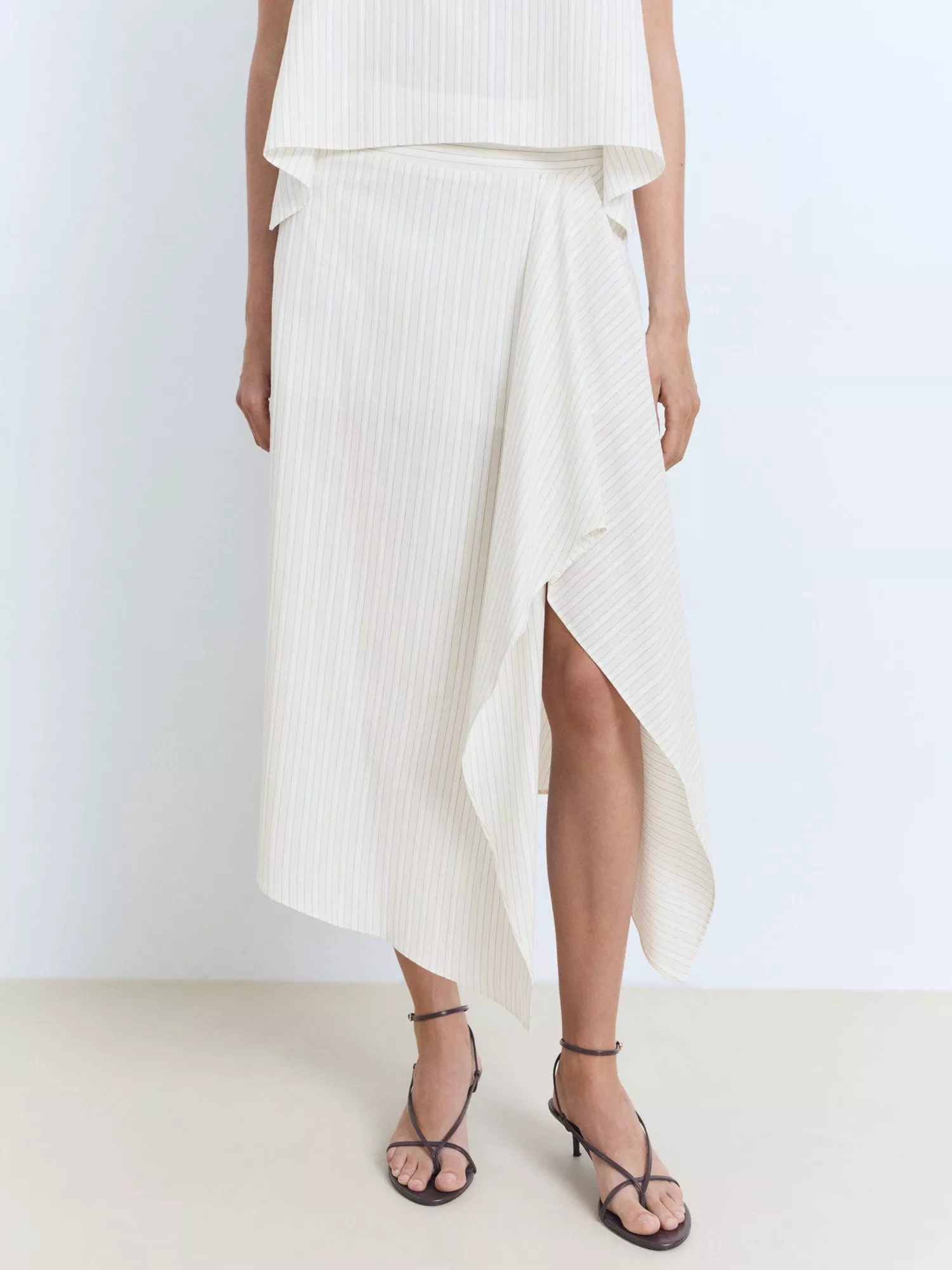 Mango's midi asymmetric A-line denim skirt champions comfort and flair for busy days out. Its clever striped design offers effortless style, with all-cotton softness and a handy zip fastening. Ideal for elevating your everyday look while keeping things practical and cool.