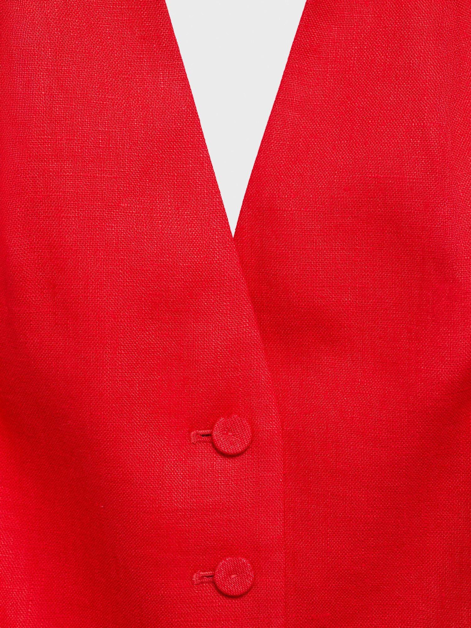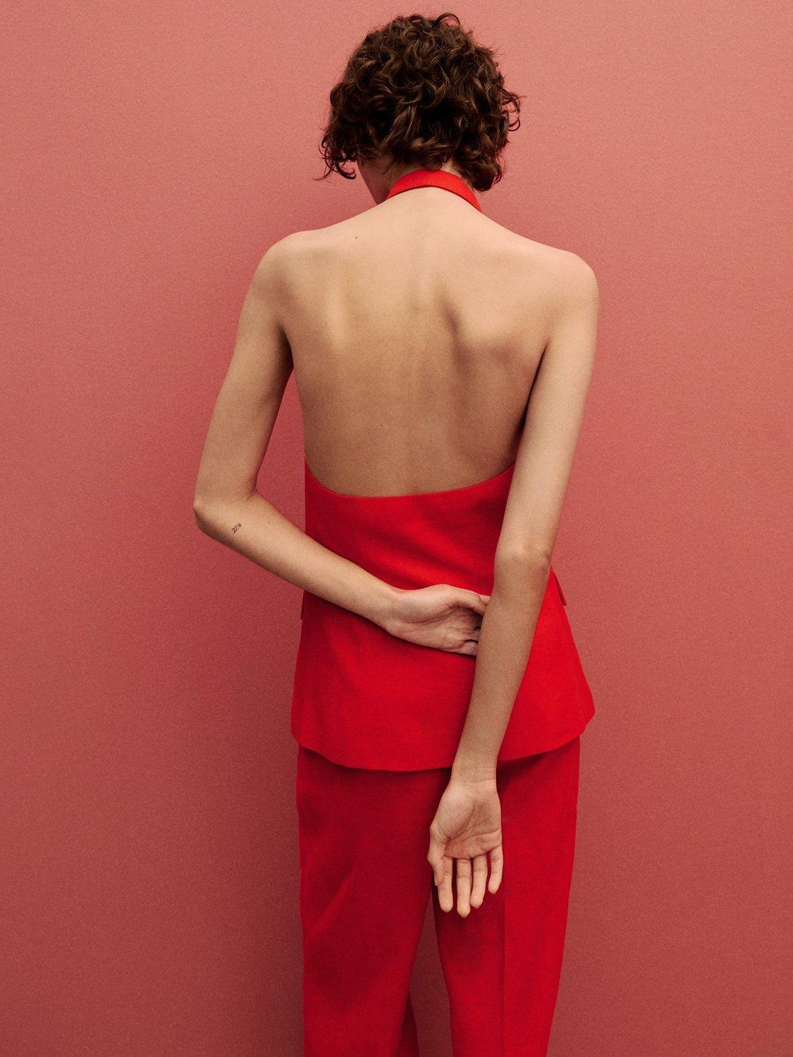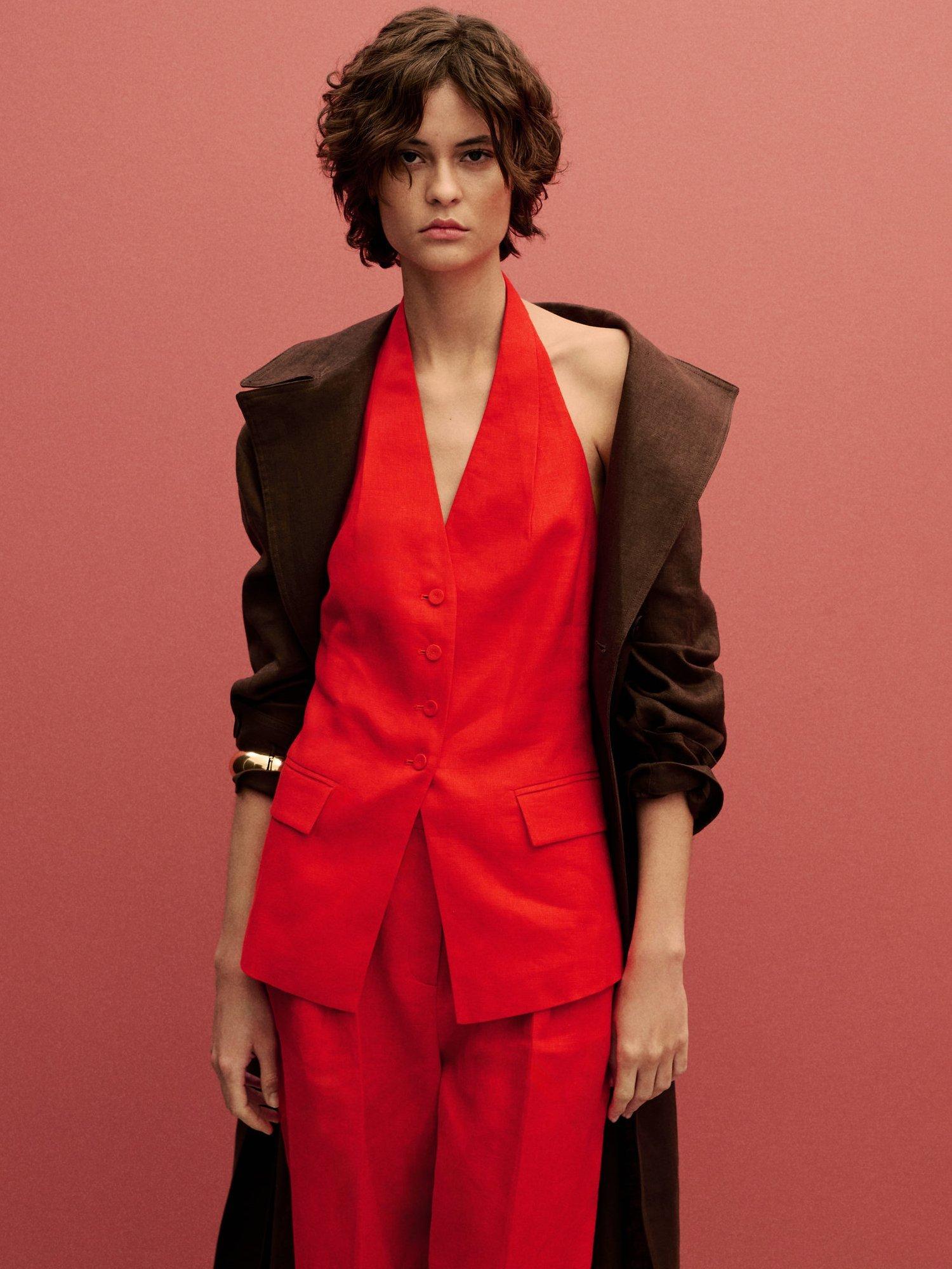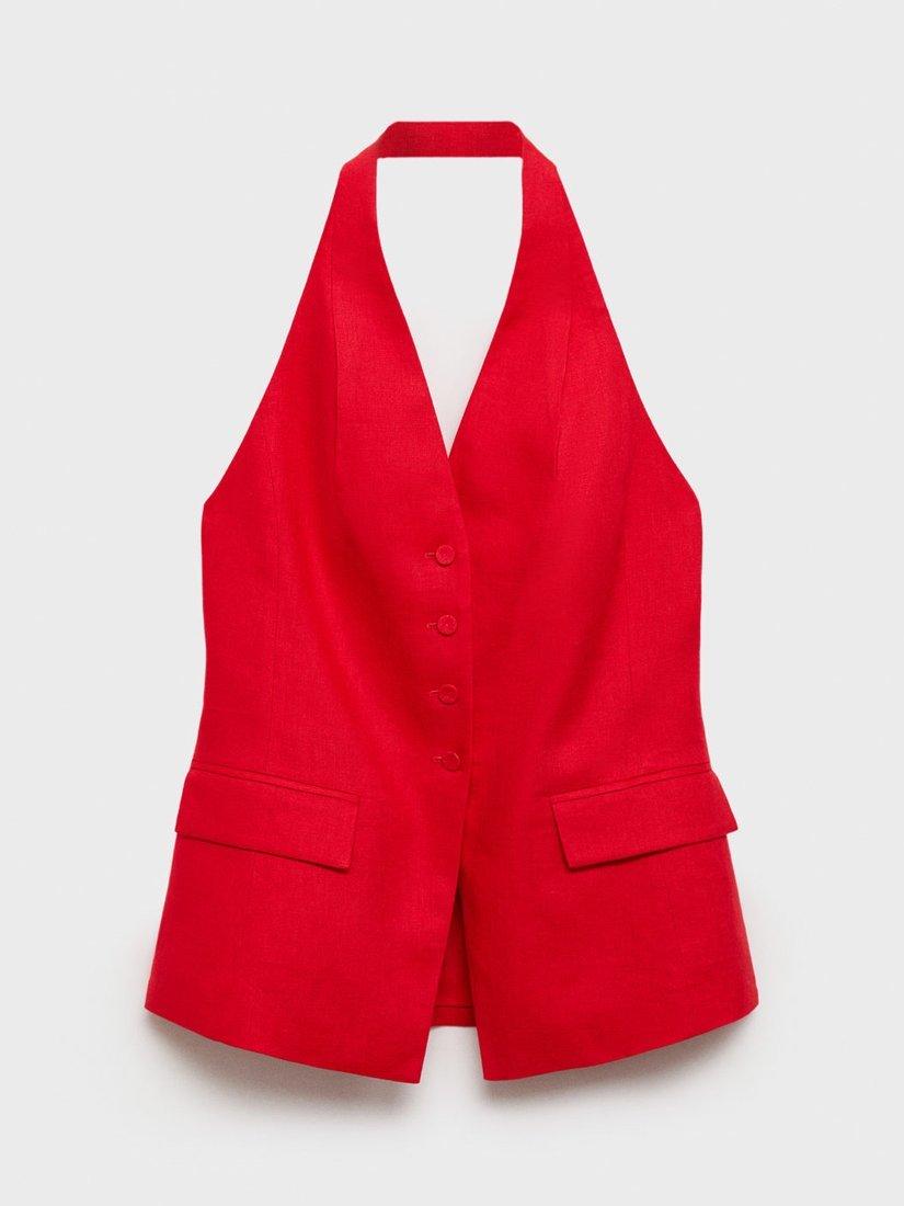 Mango’s halterneck waistcoat elevates eveningwear with a distinctive design and thoughtful detail. Crafted for comfortable elegance, it offers a fresh perspective on classic tailoring in pure linen.