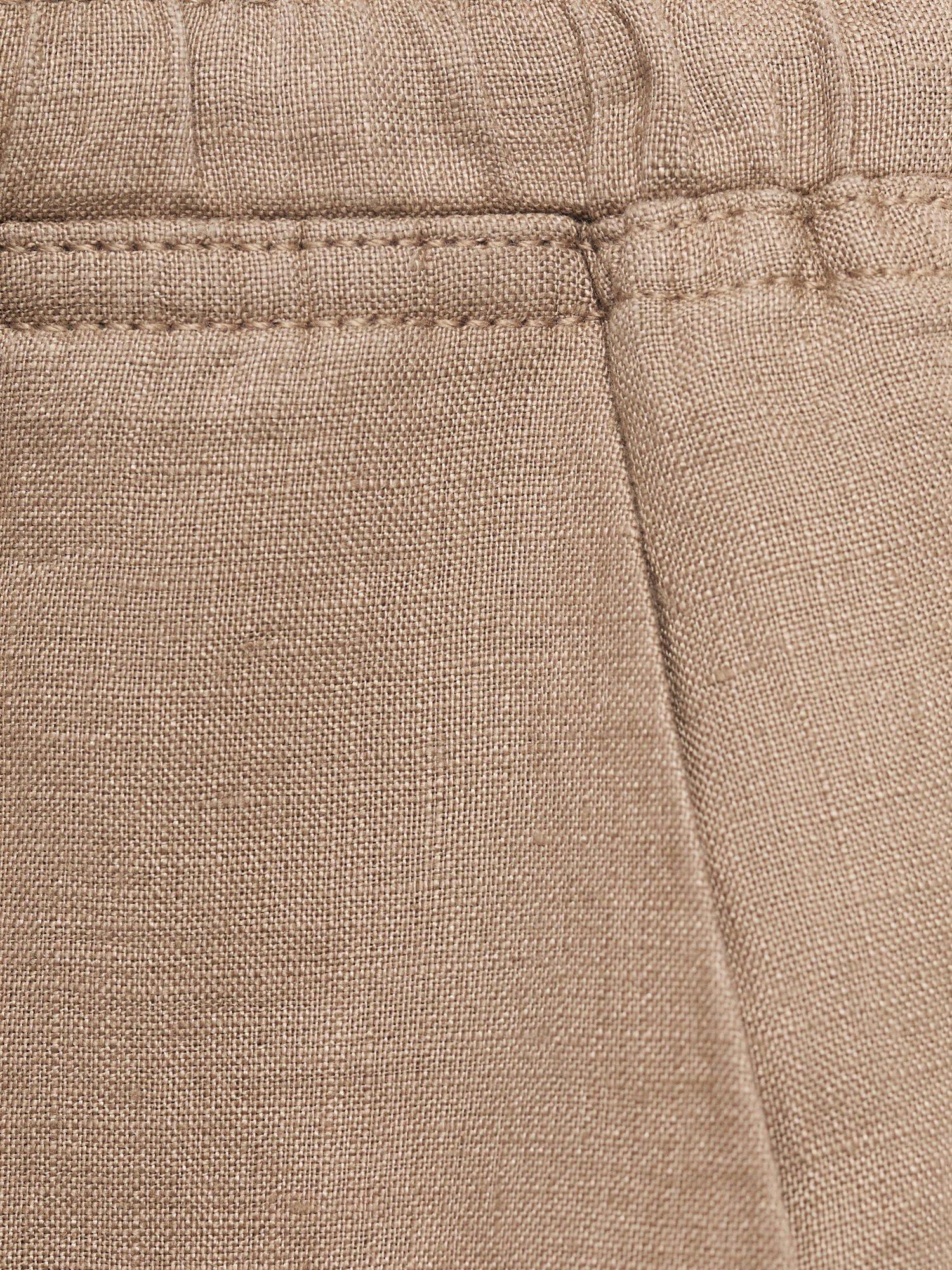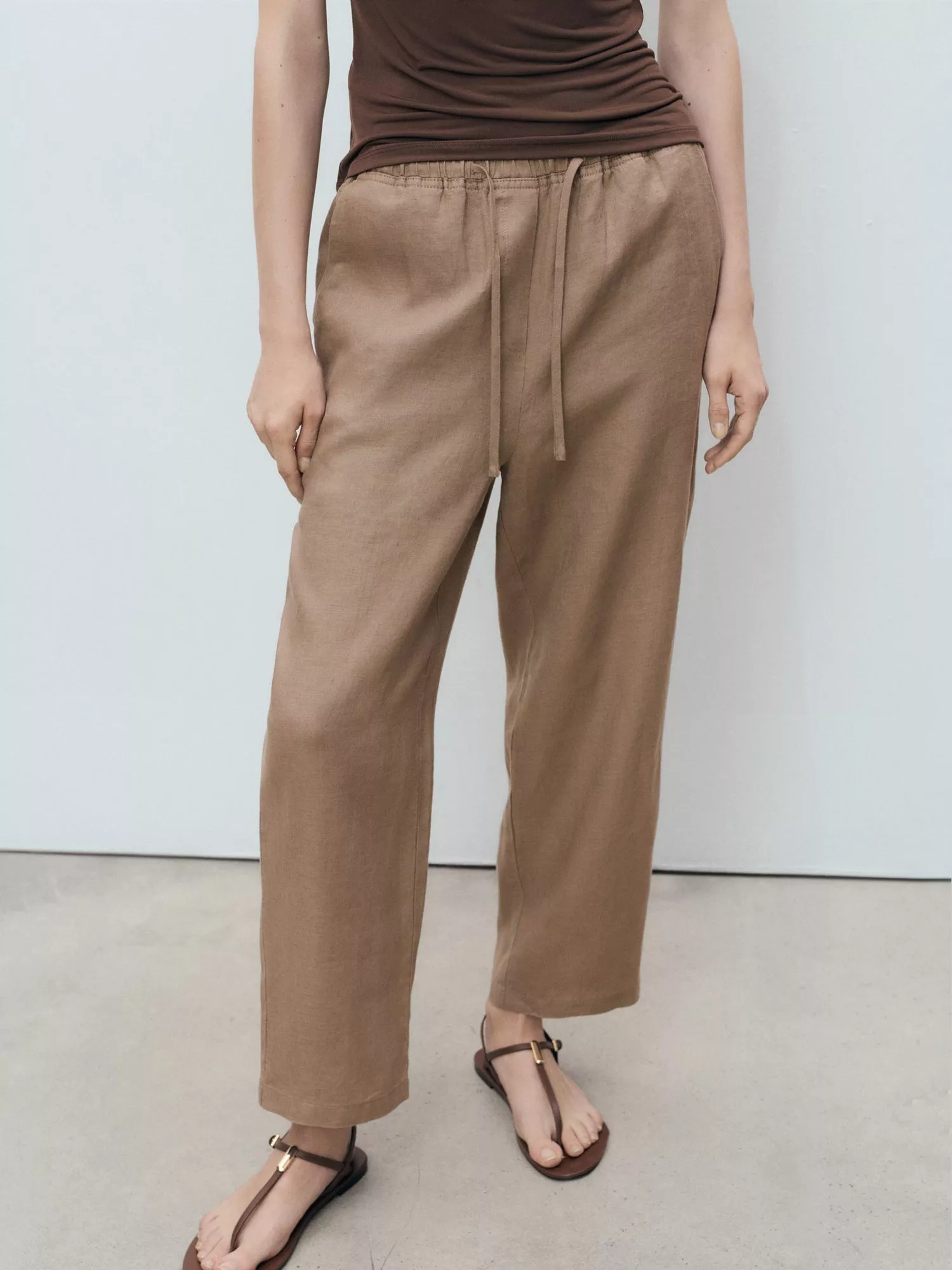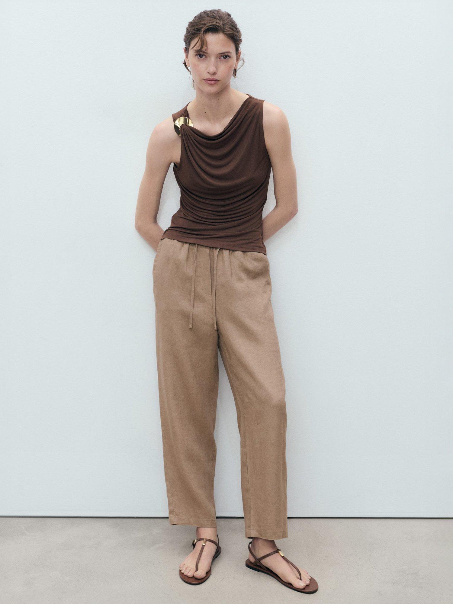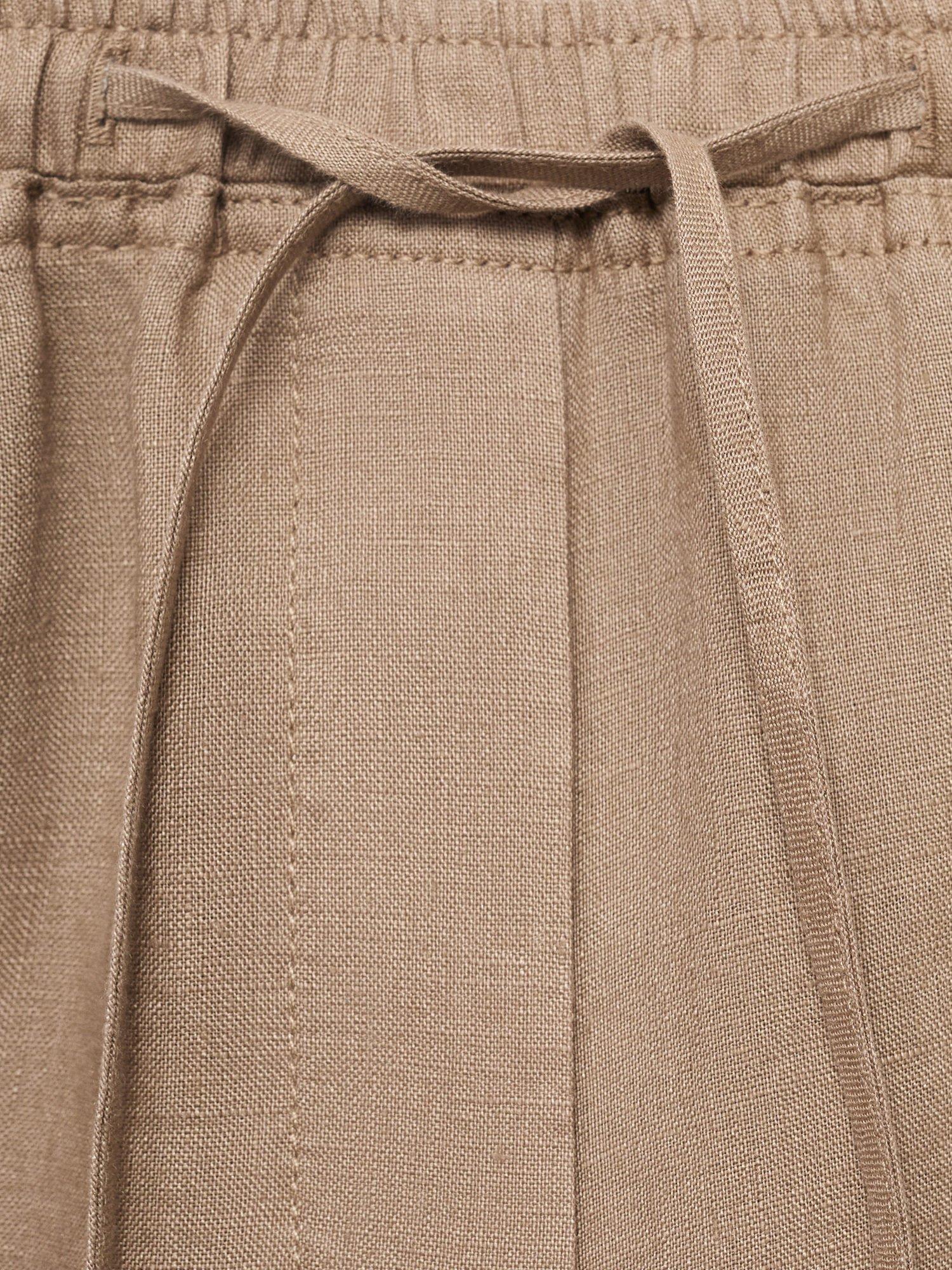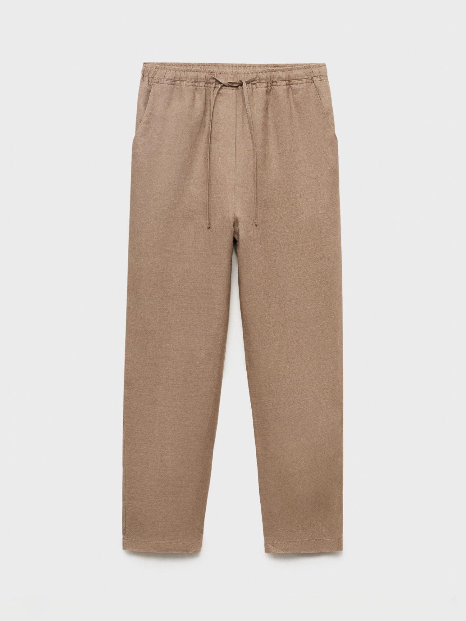 A pair of straight leg trousers from Mango made from nothing but linen. They are designed to sit mid rise with an elasticated drawstring waist and hems that fall to a regular length.