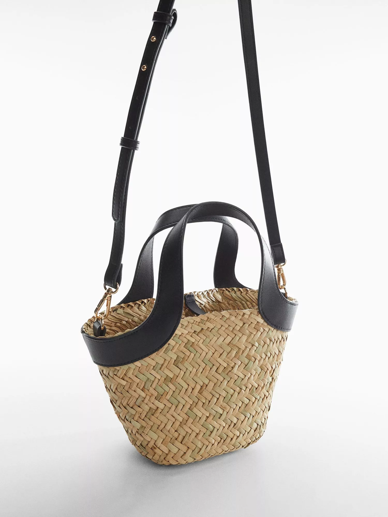 Perfect for sunny days thanks to its straw construction and with an adjustable strap for a personalised look, it is closed with a popper fastening.