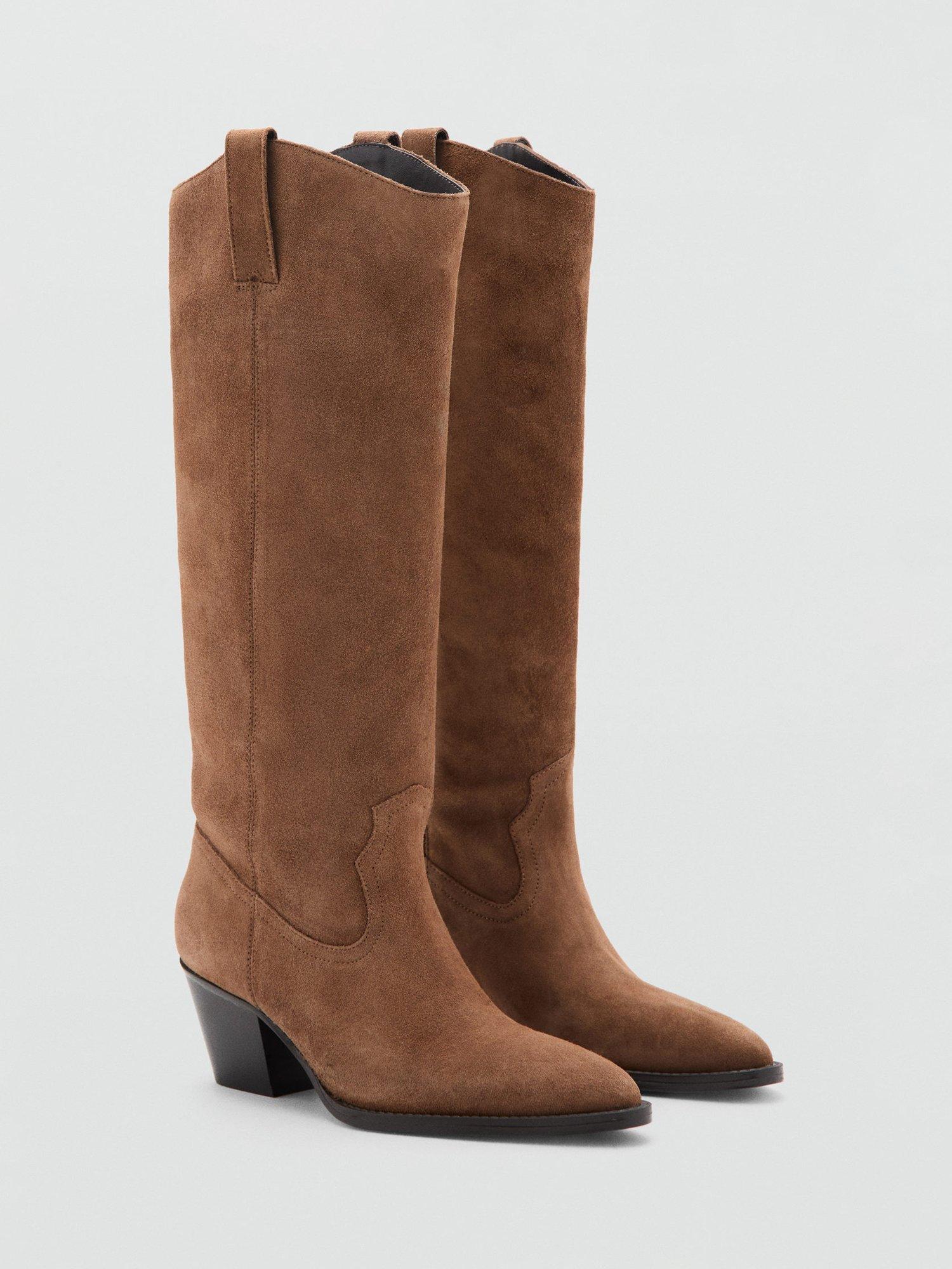 Suede leather cowboy knee boots. The mid block heel provides comfort and stability, while the pointed closed toe brings modern edge to your look. Perfect for adding character to casual outings.