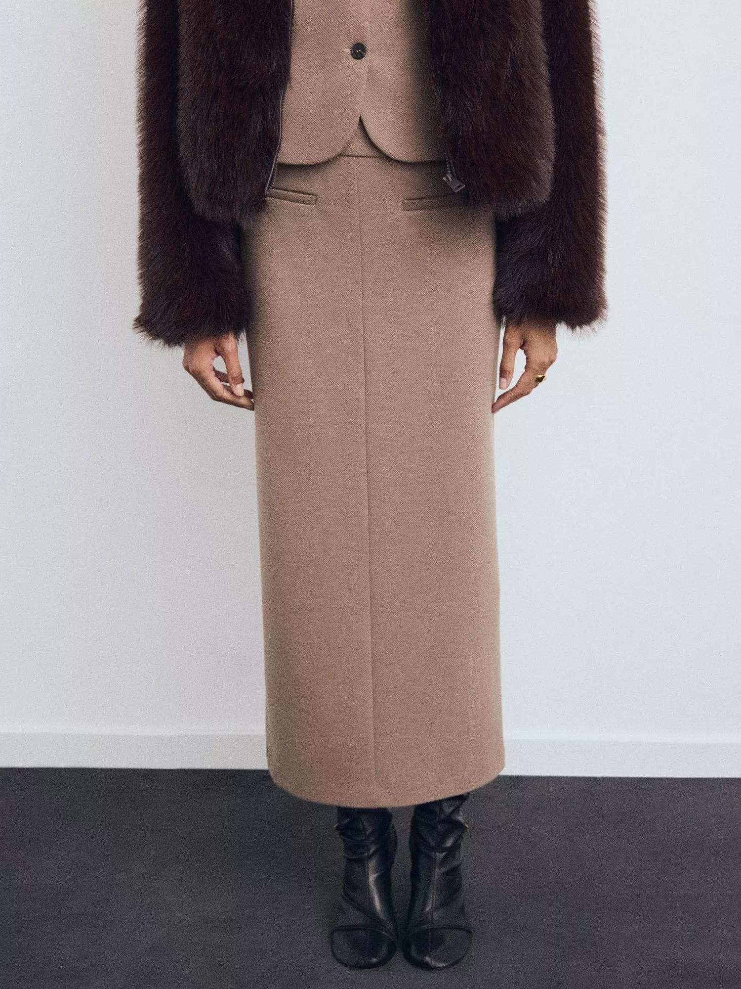 In a neat pencil silhouette, this midi skirt from Mango is lined for comfort and zips at the side for easy on-off. Equipped with front welt pockets and finished with a back-slit hem, this piece is a versatile go-to.