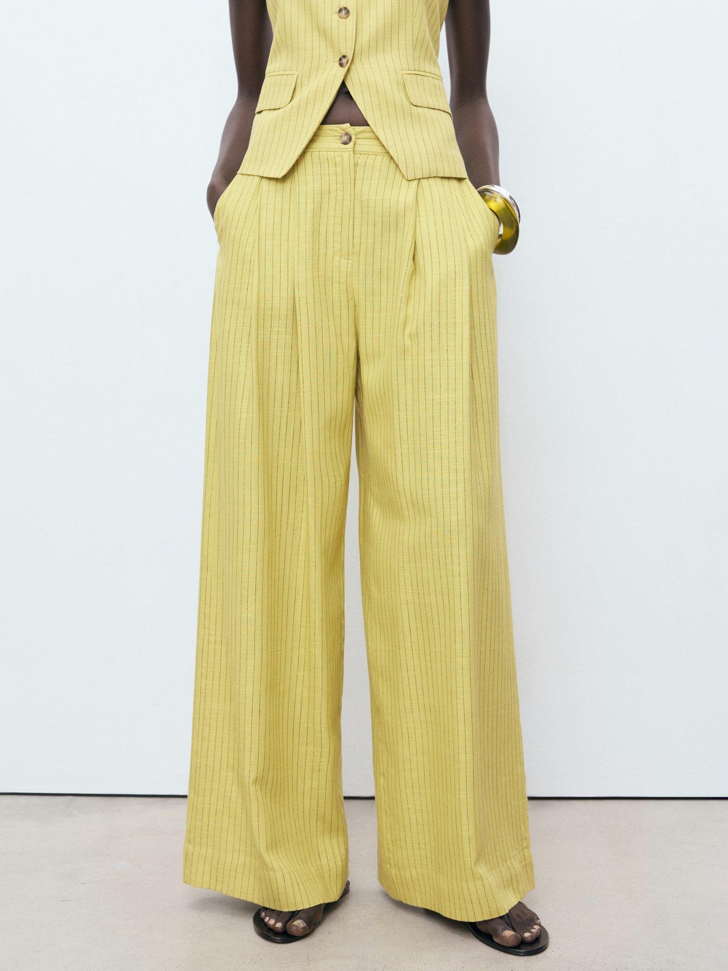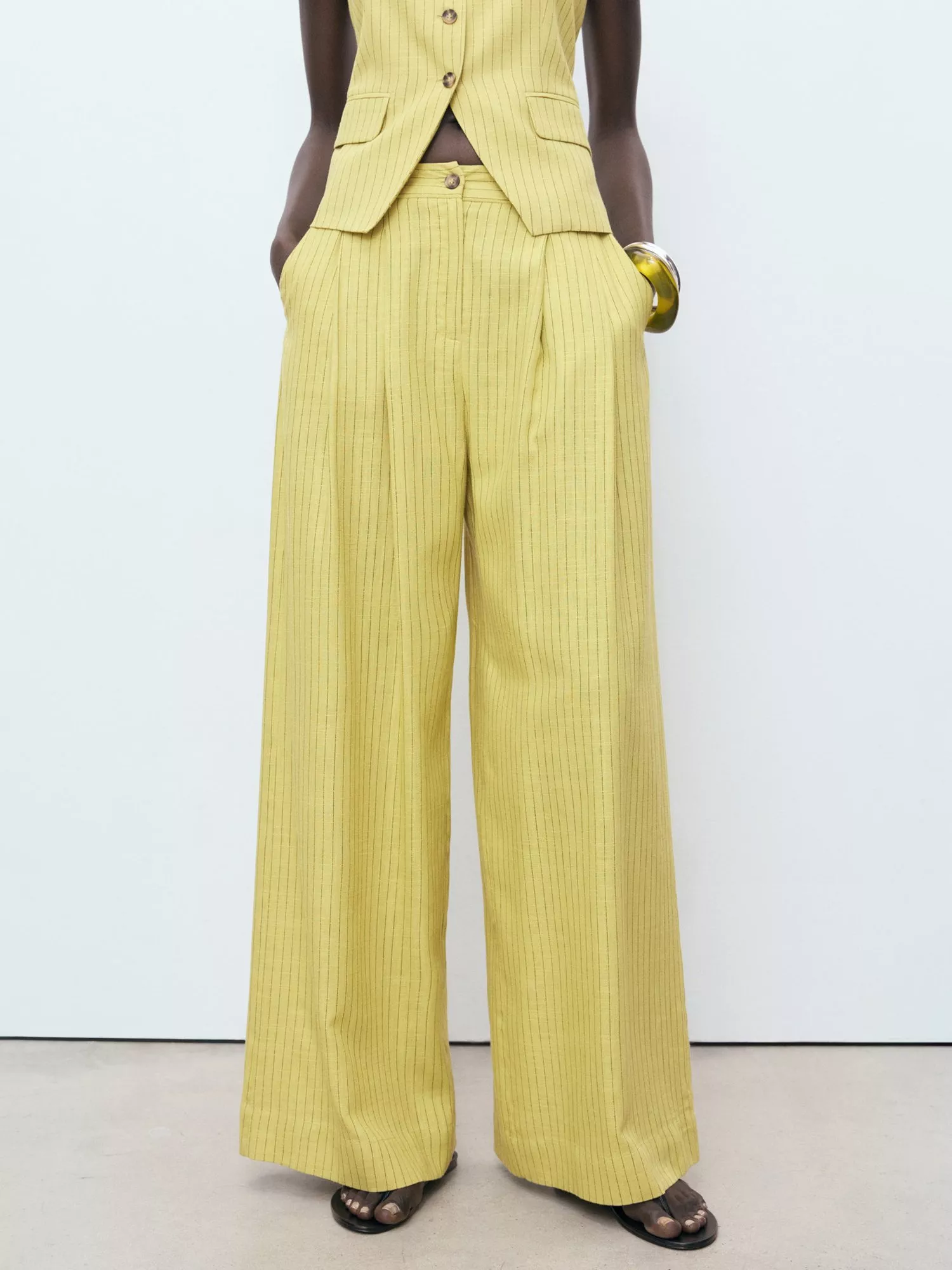 A pair of tailored wide leg trousers featuring a striking stripe pattern. The mid-rise fit and practical button and zip fastening offer comfort and ease for your day, making each moment sharper and smarter.