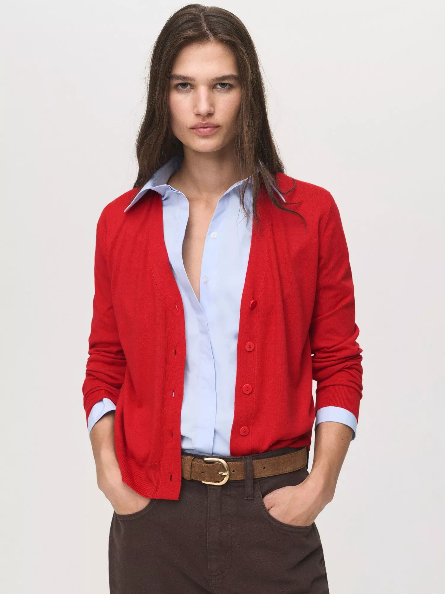 A medium-weight cardigan for instant comfort. Its soft viscose blend and smart V-neck fit easily into your wardrobe, ready to elevate your day whether you are at work or unwinding at home.