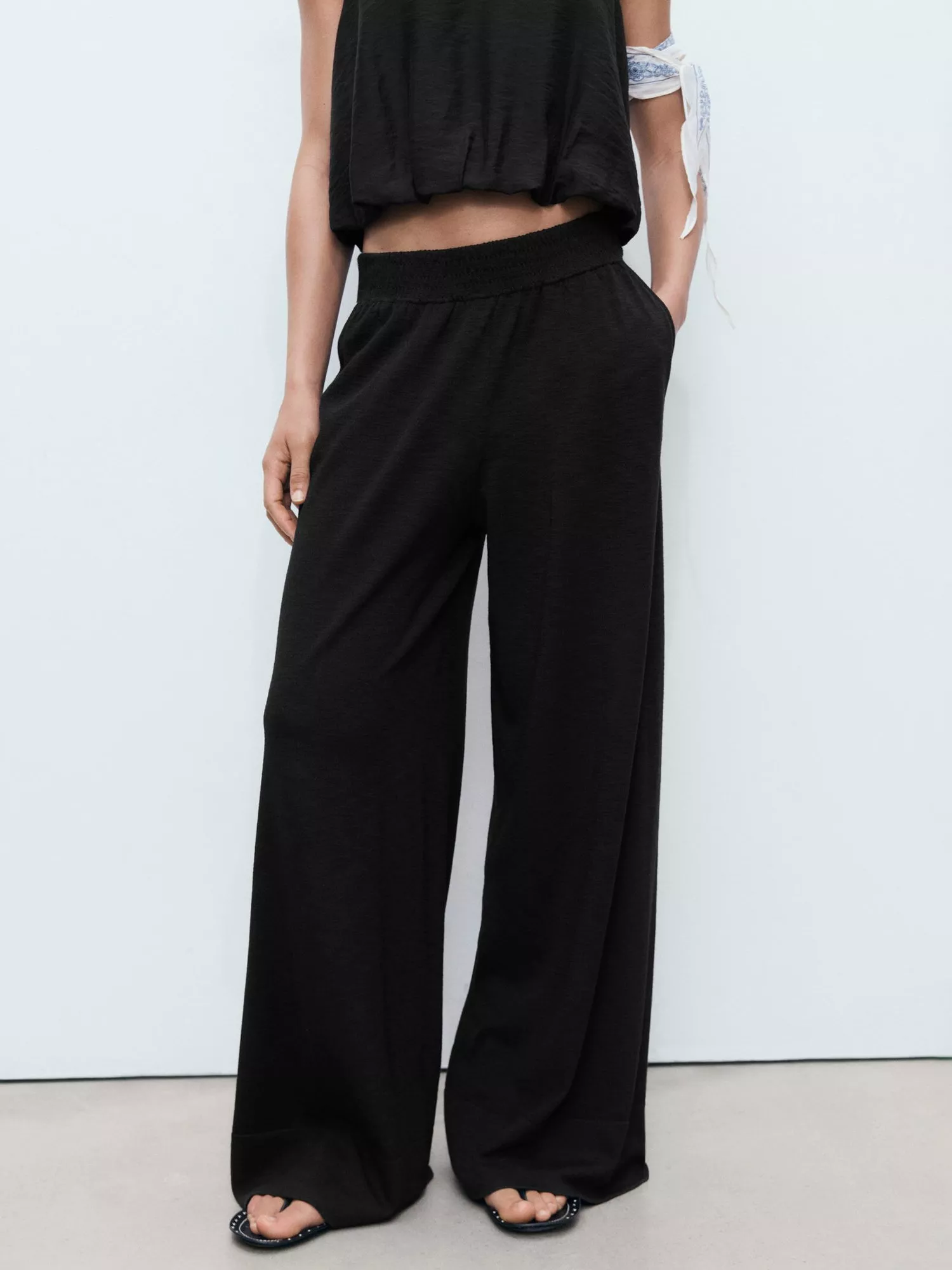 Sharp tailoring meets effortless confidence in these fine knit wide-leg trousers from Mango. They are designed to sit mid rise with an elastic waistband and regular length hems.