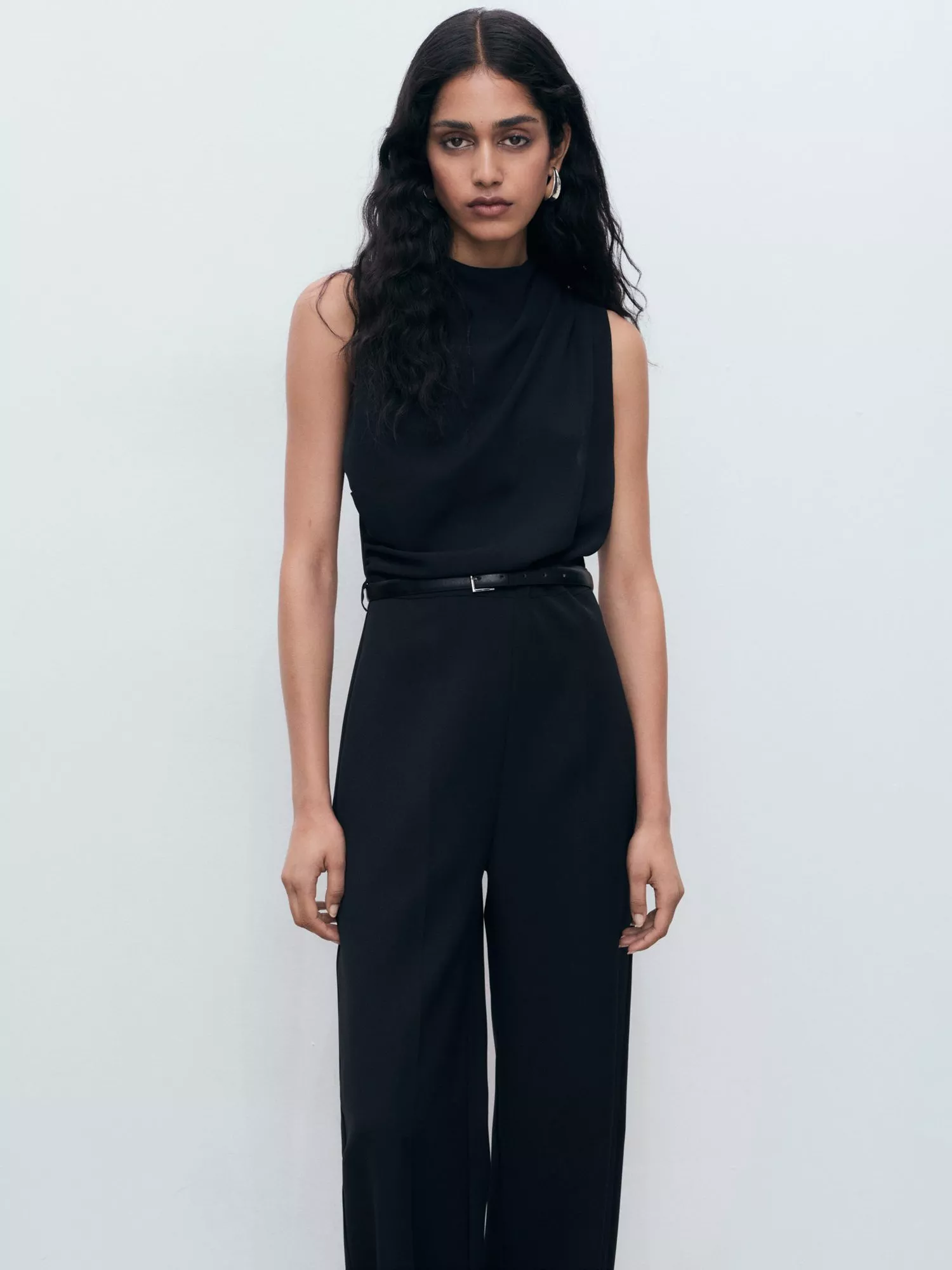 A sleeveless straight-leg jumpsuit with a round neck and plain design, featuring a zip fastening and a matching belt. Designed for comfort and confidence, it helps you express your unique style in any setting while keeping things practical.