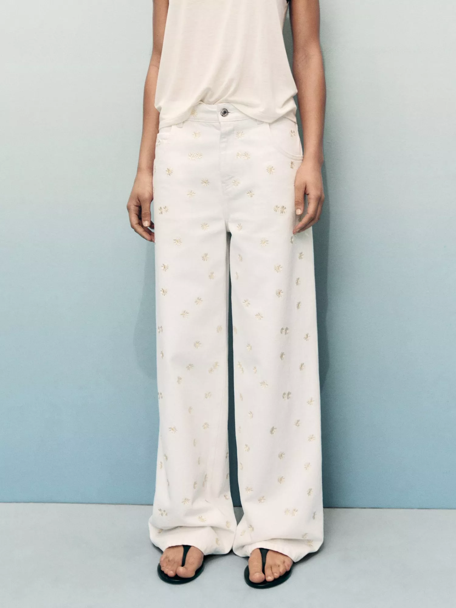 Relaxed and oversized through the legs, introducing this pair of wide-leg jeans from Mango with pretty floral embroidery. Made from pure cotton featuring a mid rise and a button and zip fly, they fall to a regular length.