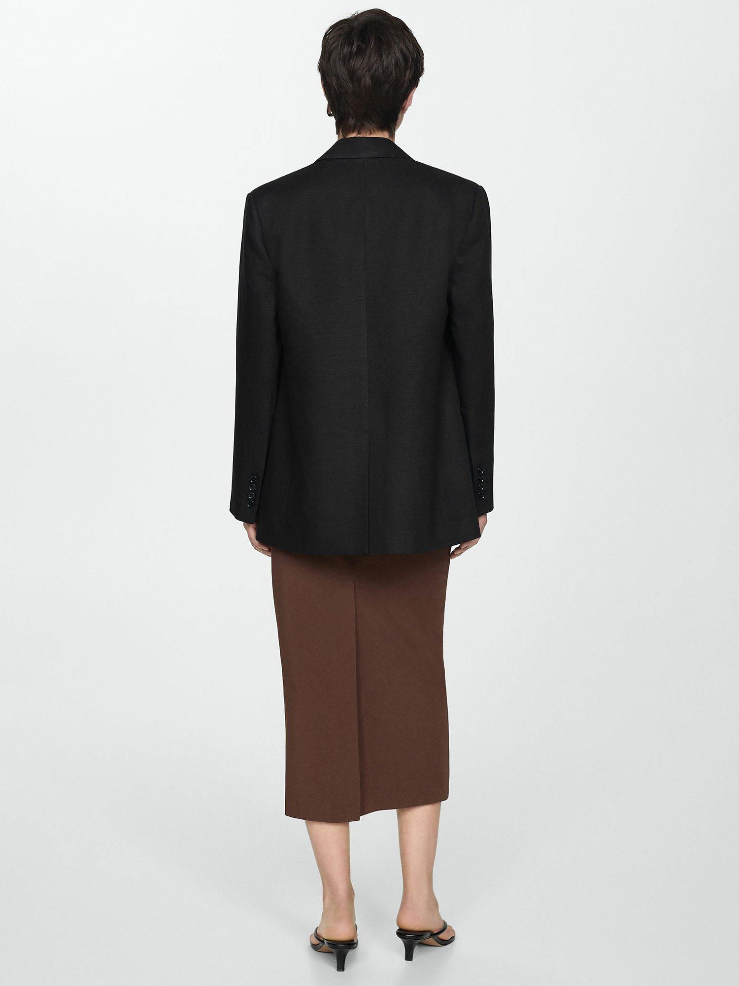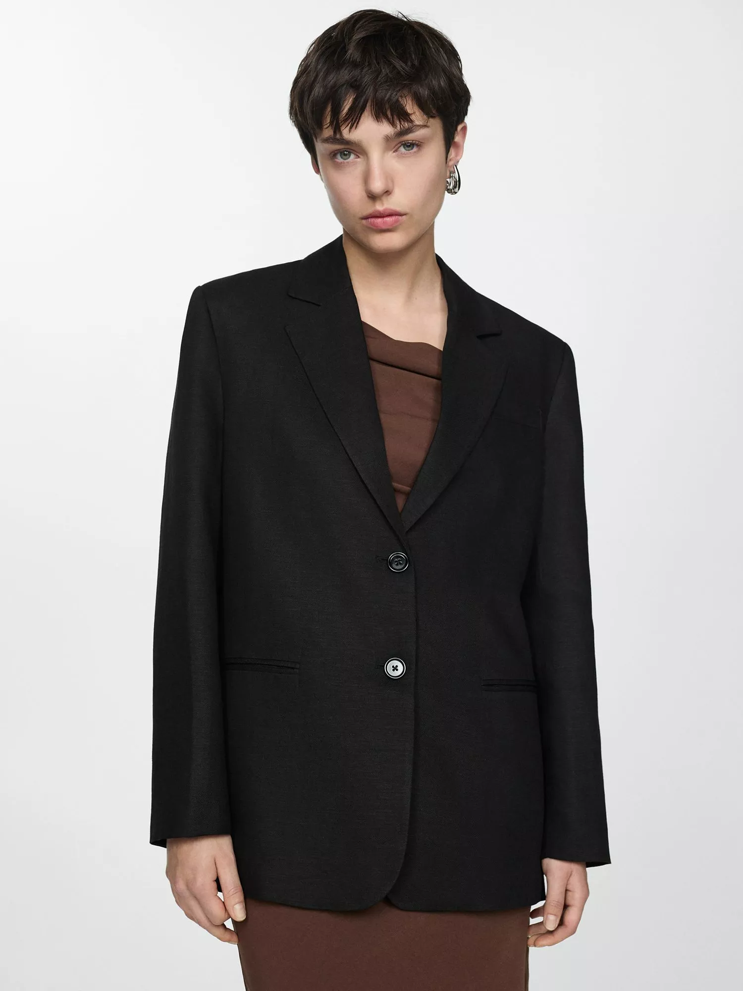 Linen mix, oversize design, straight design, lapel-collar V-neck collar, lapel with notch, long sleeve with buttoned cuffs, two welt pockets on the front, welt pocket on the chest, front button closure, inner lining.