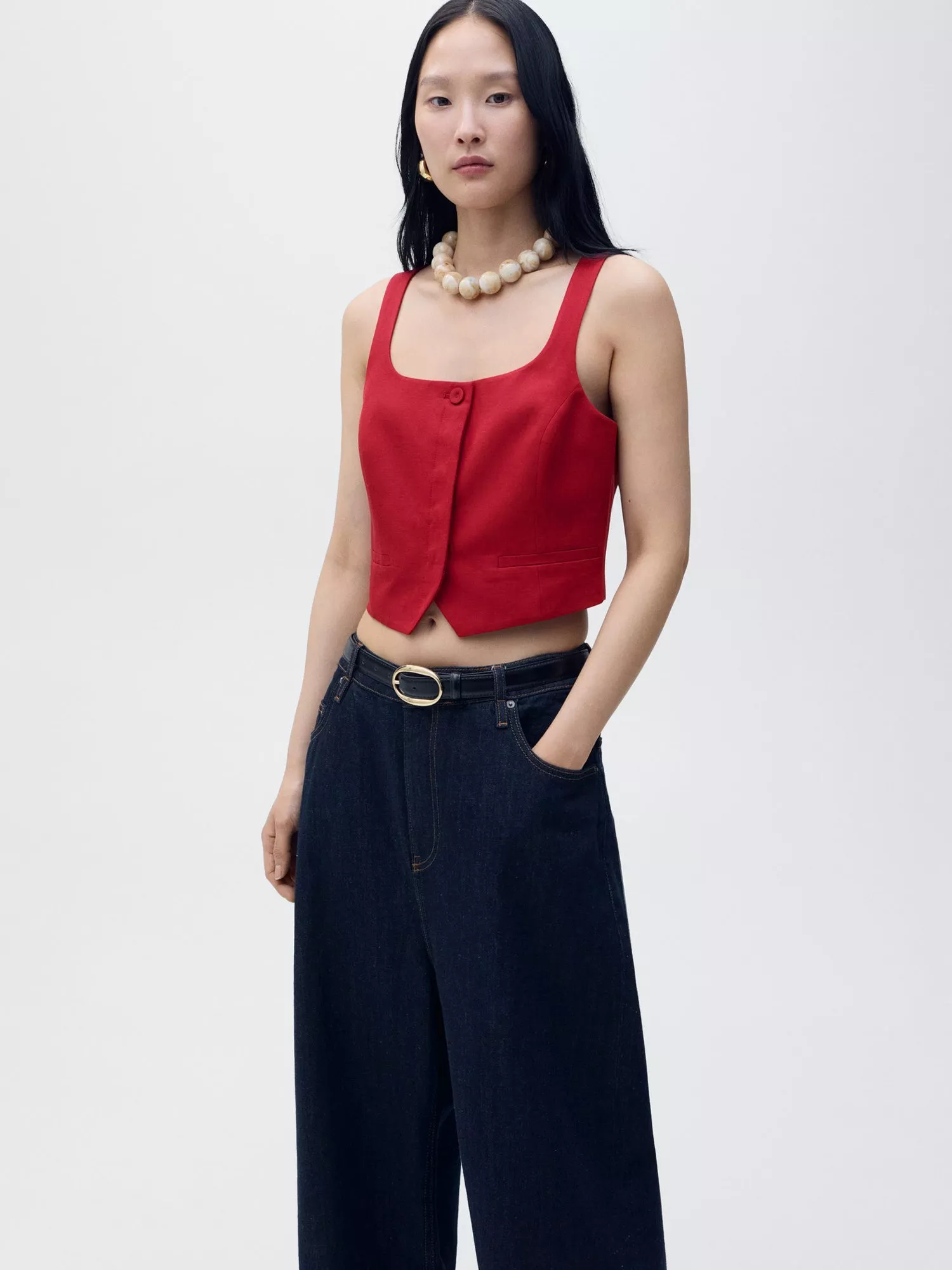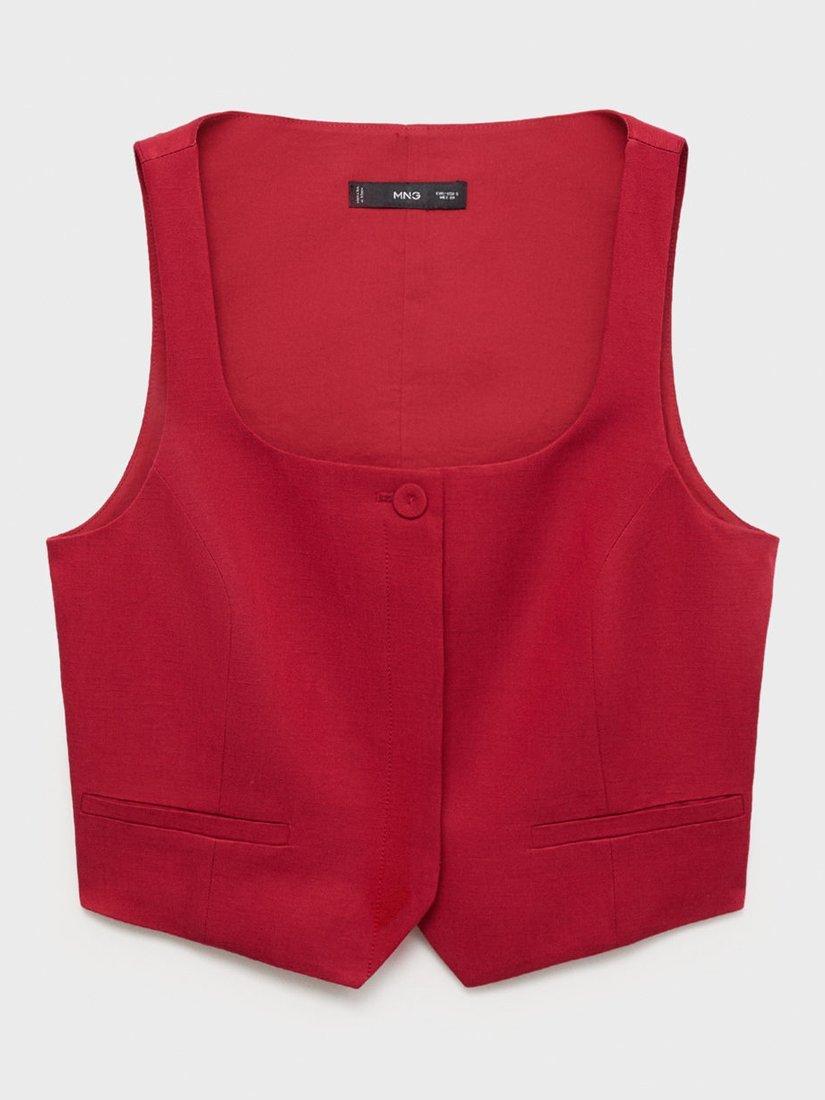 Cut from a breathable linen blend, this waistcoat from Mango is framed with a contemporary square neckline that can be worn solo or layered.