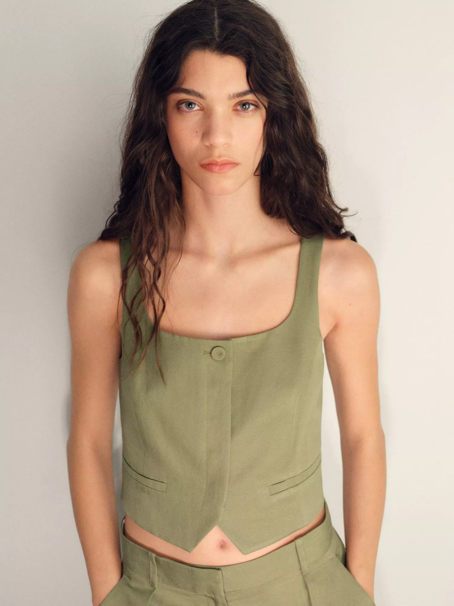 This single button waistcoat features a sharp square neck and a button fastening, offering comfort and style for your busy day or at work. Its thoughtful fabric blend keeps you feeling cool, while the clean design adds lively energy to your look.