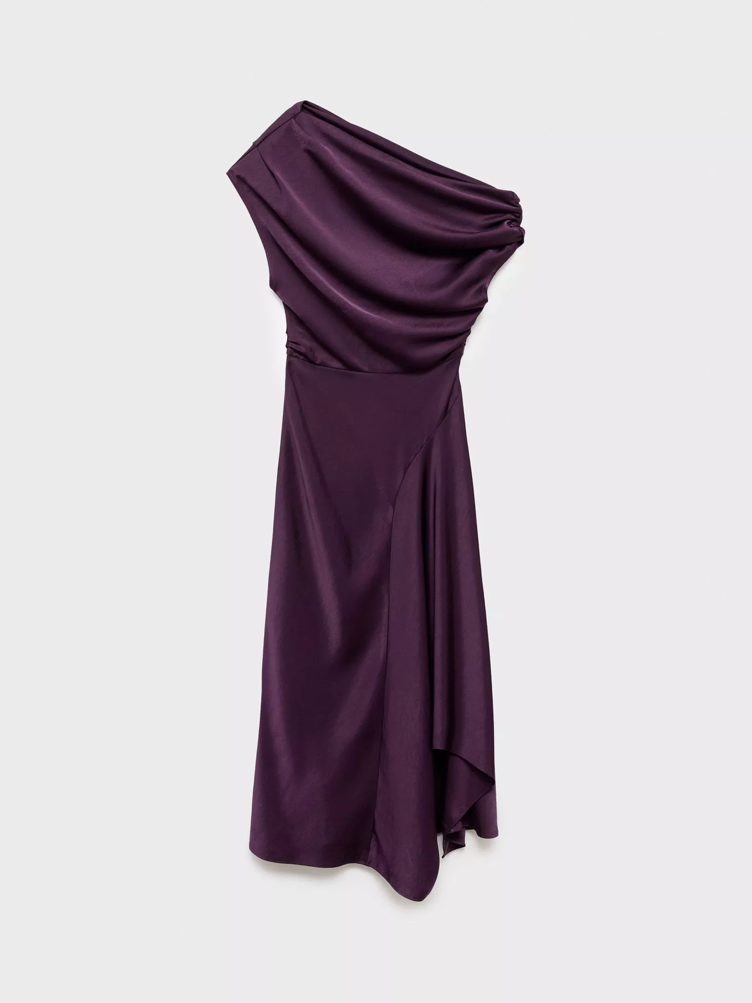 This satin-finish midi dress features a draped asymmetric neckline, offering a confident silhouette ideal for evening events. Its one-shoulder design ensures you stand out falling to an uneven hem. Features a zip fastening at one side.