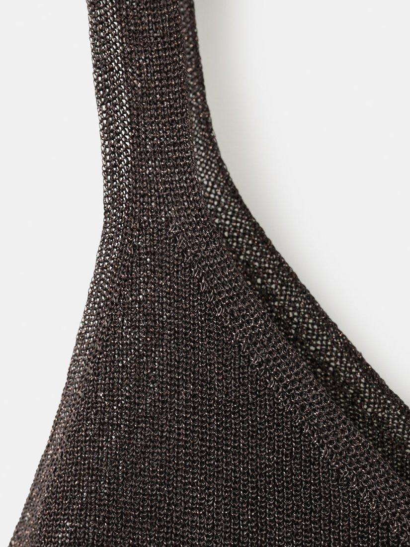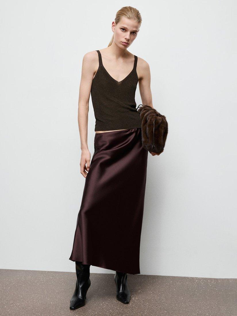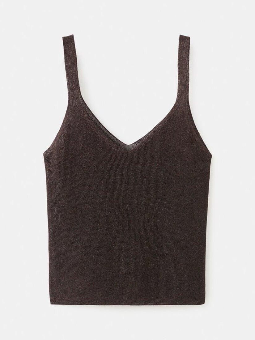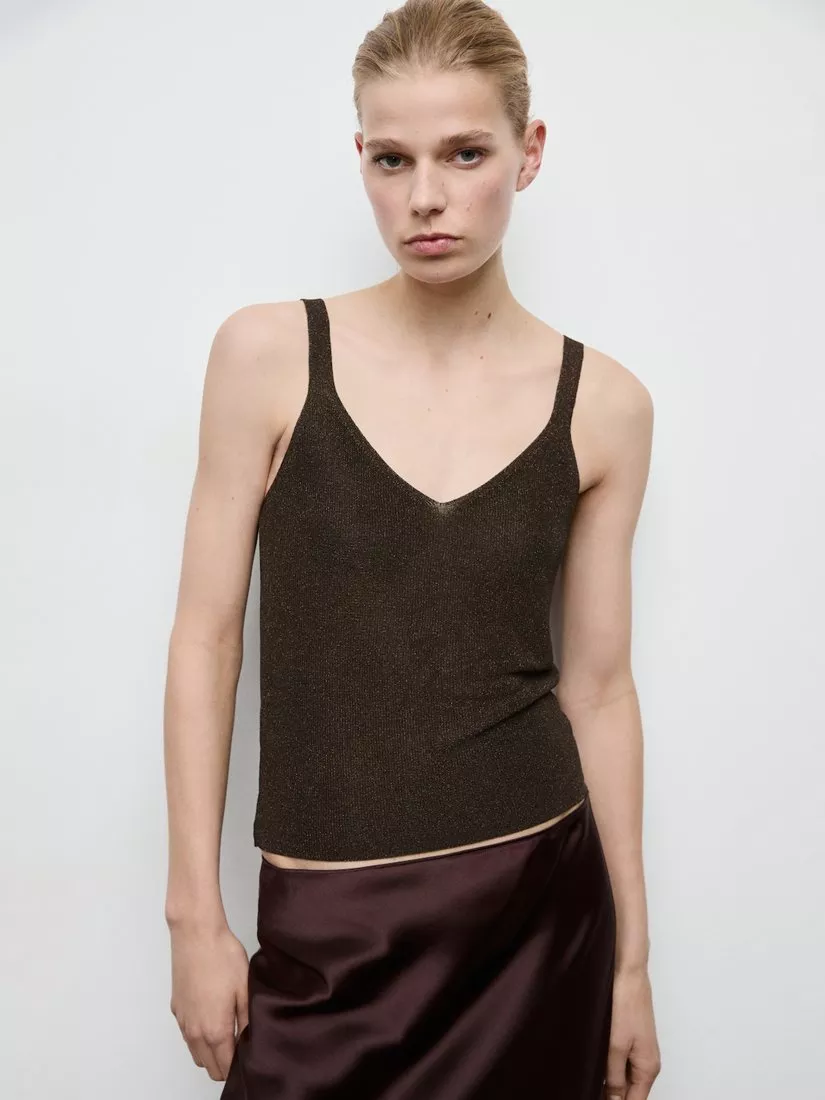 A metallic shimmer camisole by Mango, featuring a sculpted V-neck and thin straps. The ultimate piece for evening styling.