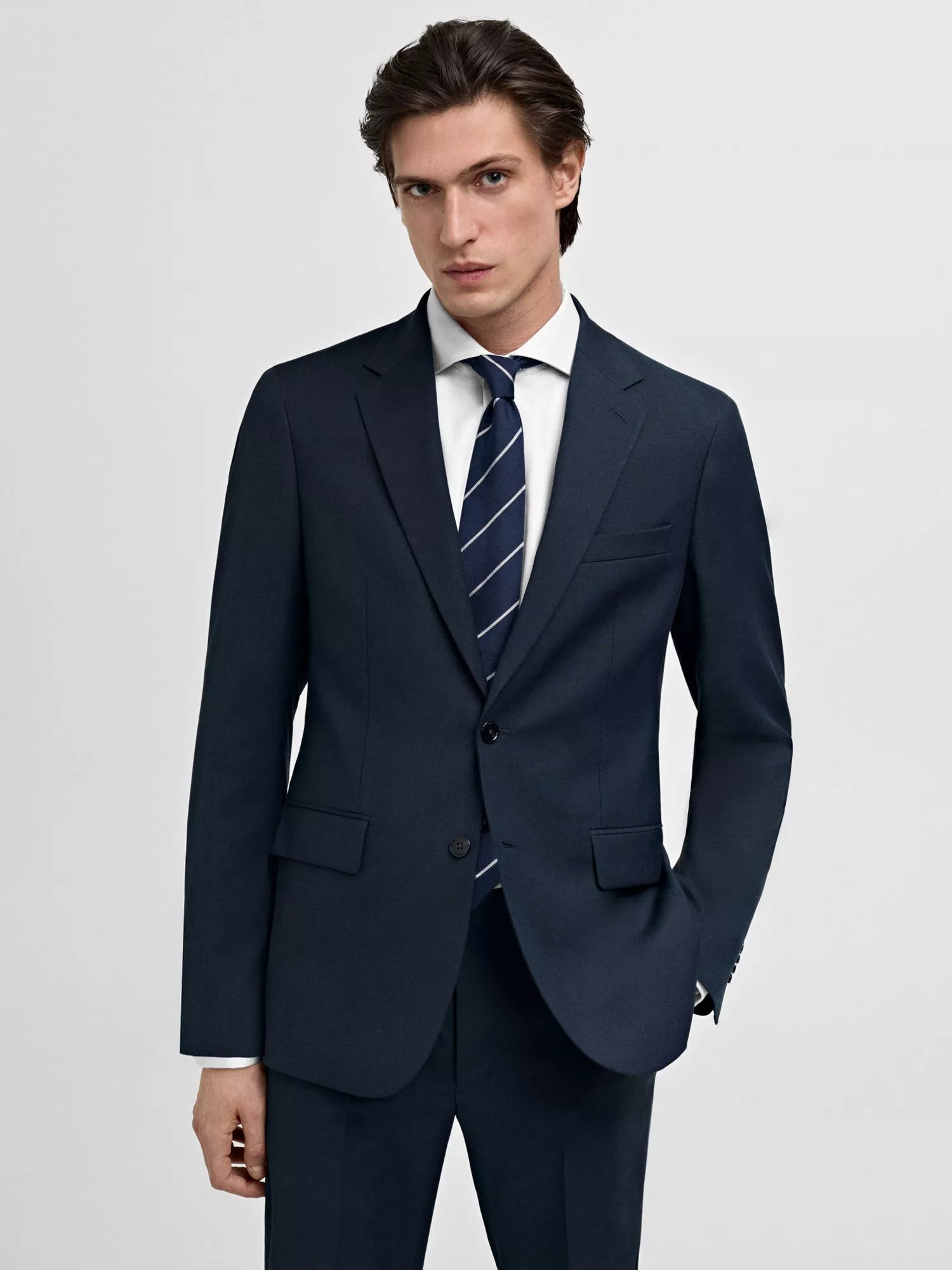 Tailored to perfection, this single-breasted blazer from Mango is made from a comfort stretch fabric that's comfortable to wear. Ideal for those who seek a plus from the classic-fit suit, without going so far as to create a tightly-fitted silhouette. The Slim Fit follows the natural lines of the body, enhancing the figure and providing an elegant and modern look.