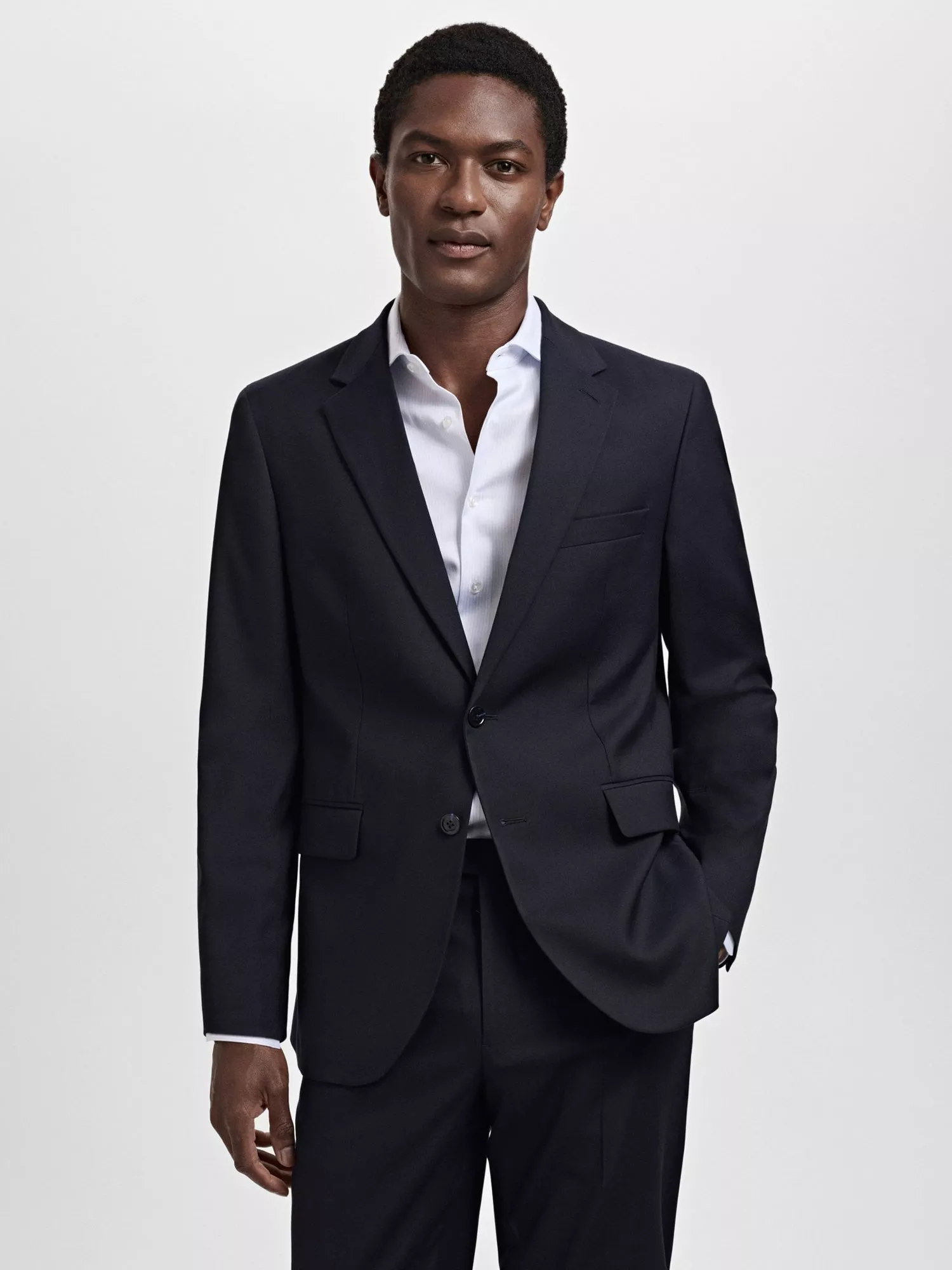 Elevate your work wardrobe with this super slim Mango blazer in a sophisticated navy blue hue, expertly crafted from a light viscose blend for a polished and professional look that will make a lasting impression.