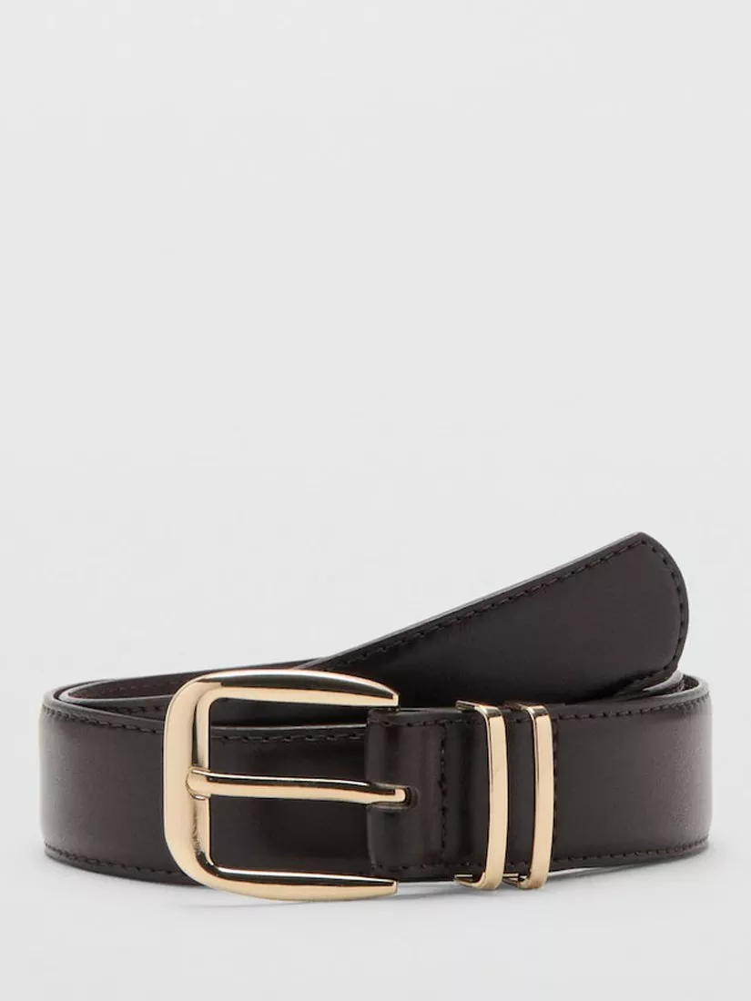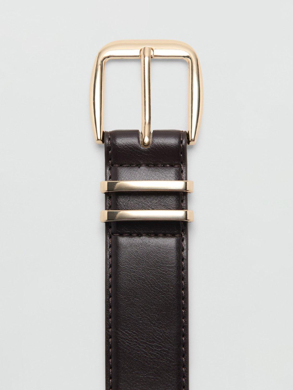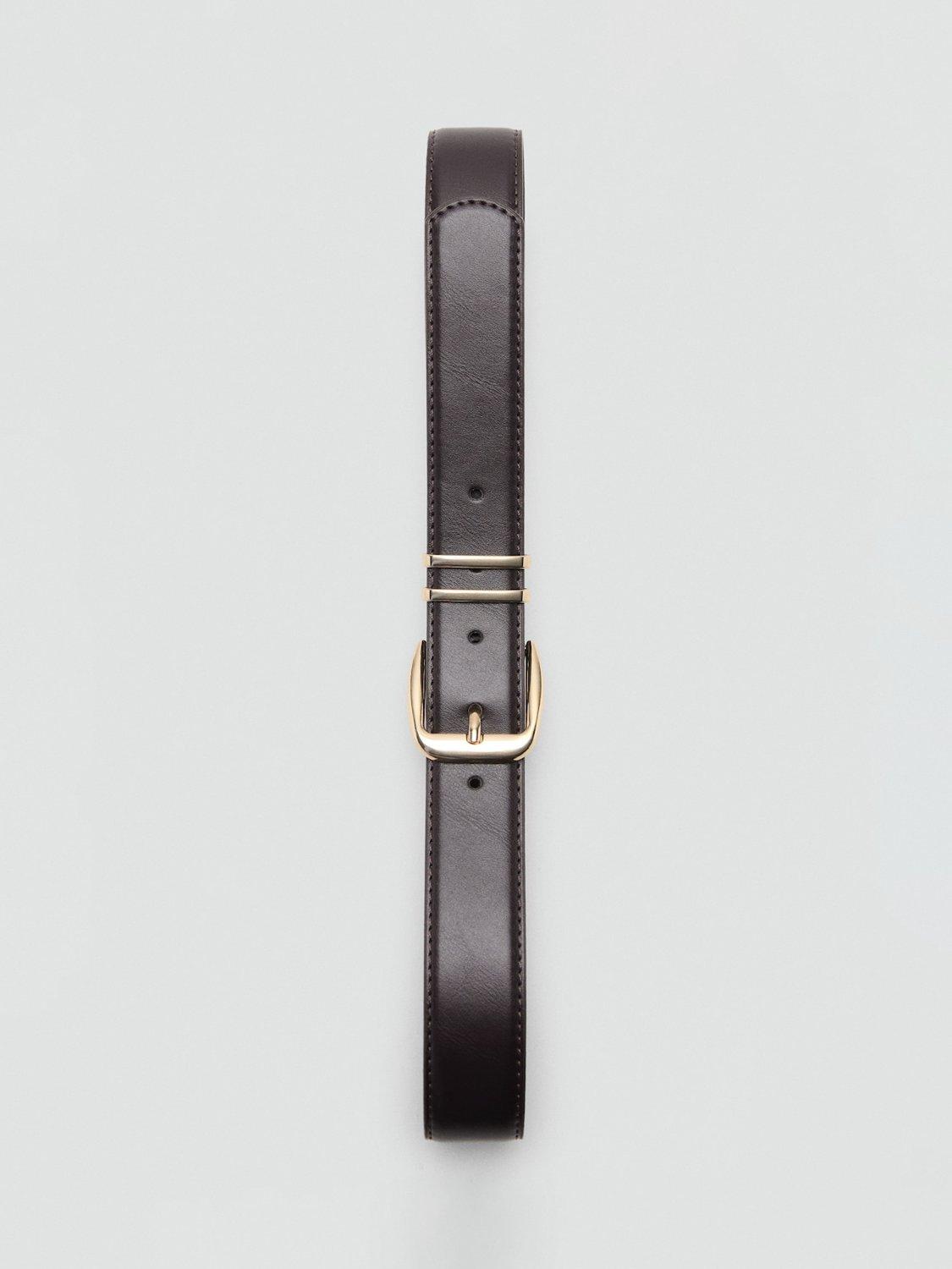 Faux leather belt with a square metallic buckle to fasten.