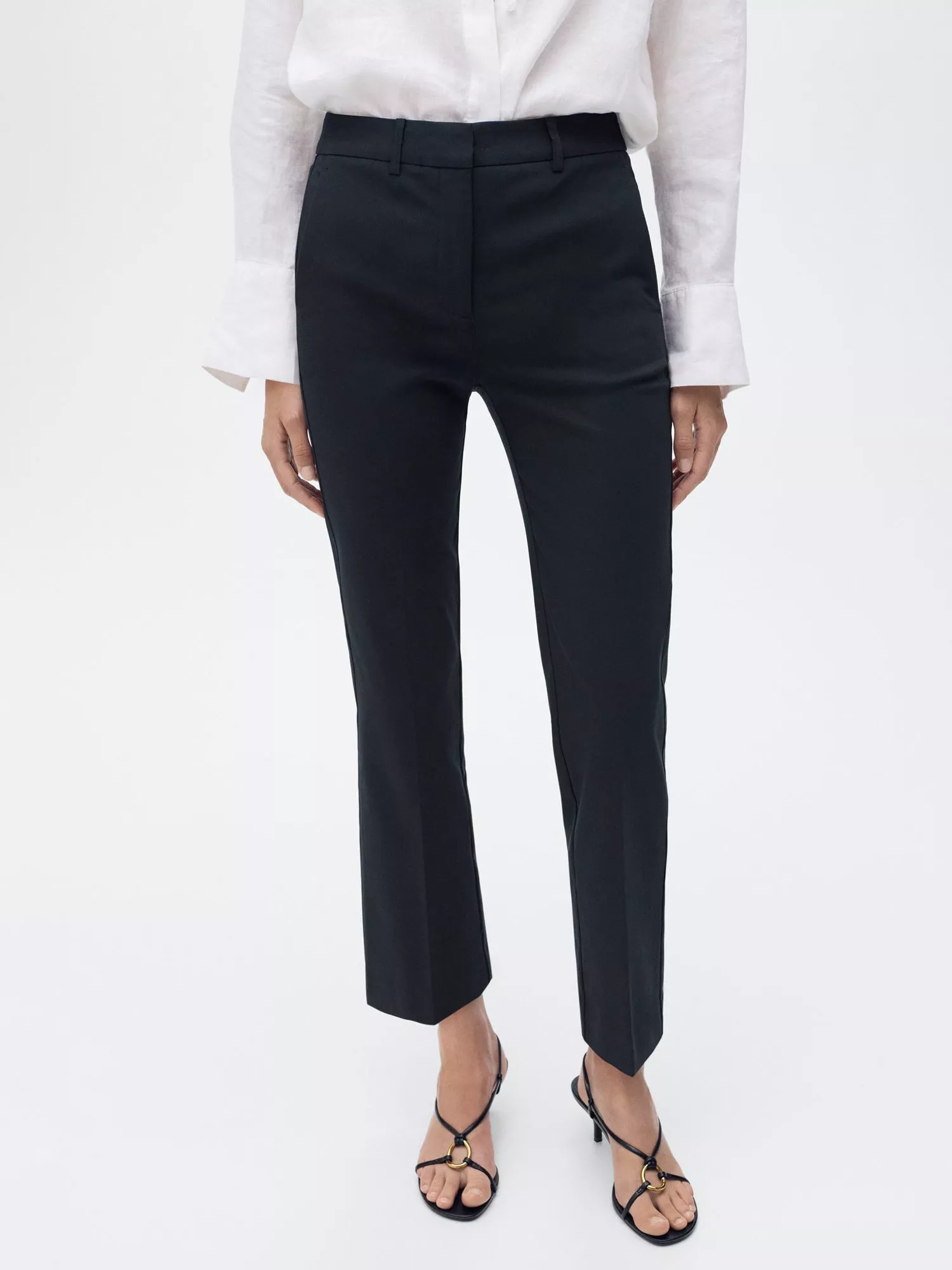 A pair of no-nonsense straight-leg trousers by Mango. They feature a mid rise with a button, zip and hook and eye, and falling to cropped hems.