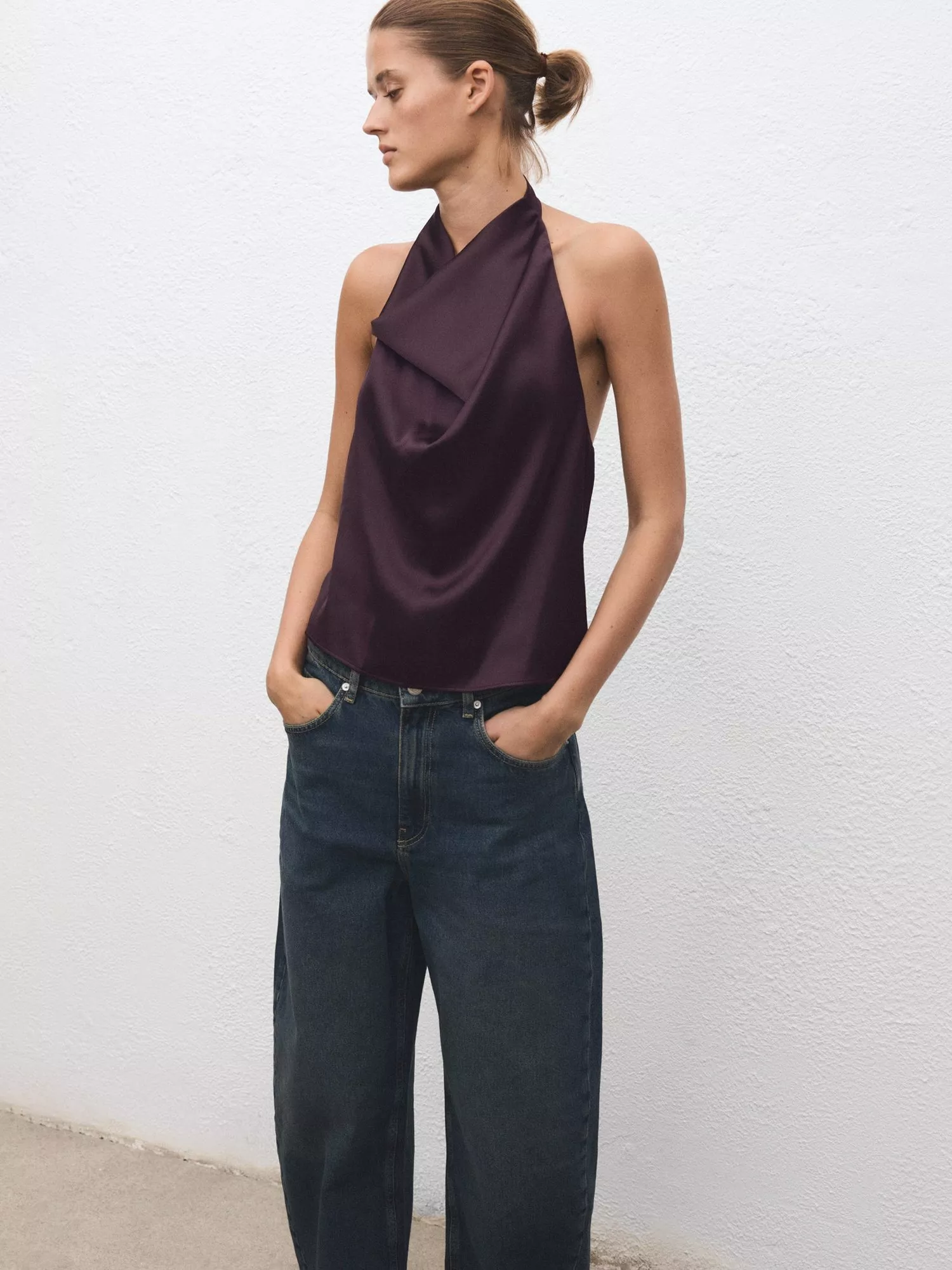 A satin top from Mango. Featuring a draped halter neckline, the plain colour is designed to go with anything. The ultimate party-ready piece.