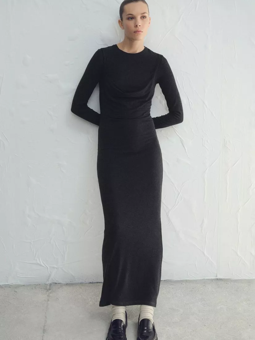 A softly knitted maxi dress by Mango. The round neck and long sleeves is layered with a draped cami bodice, while the flowing silhouette creates a flattering shape. Perfect for your daytime plans.