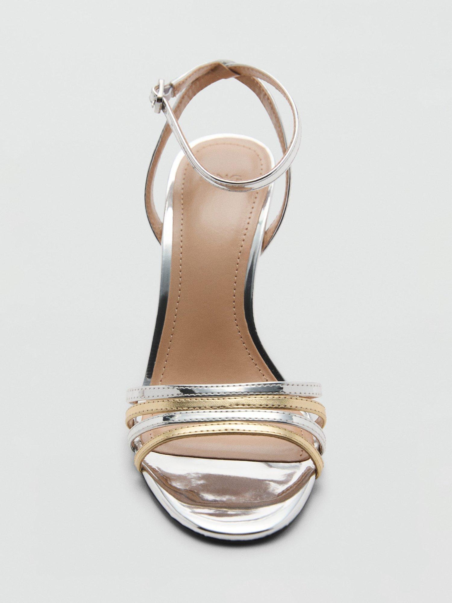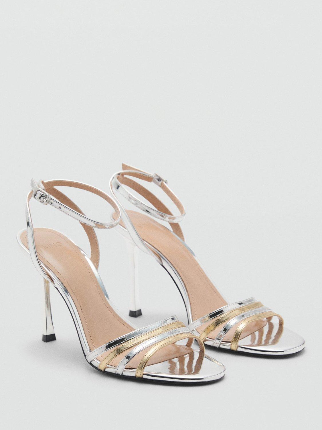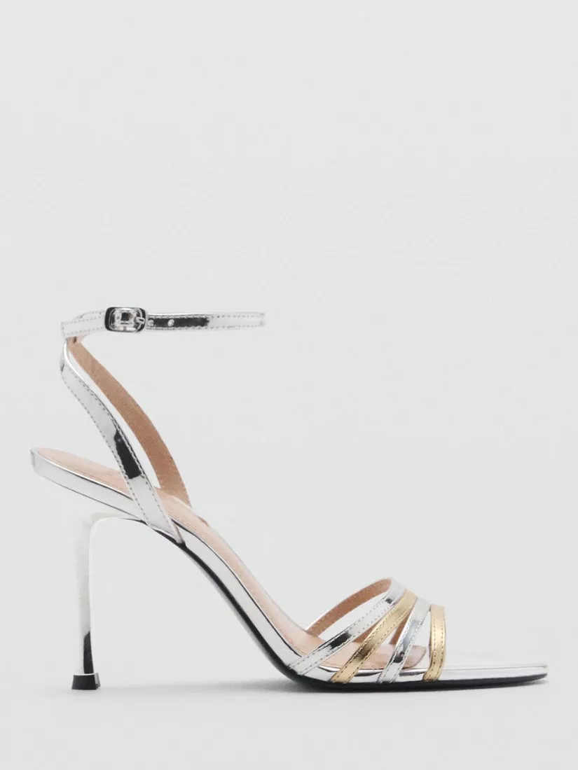 A pair of two-tone metallic heeled sandals from Mango. In a mirrored effect barely-there silhouette with a stiletto heel and an adjustable ankle strap fastening.