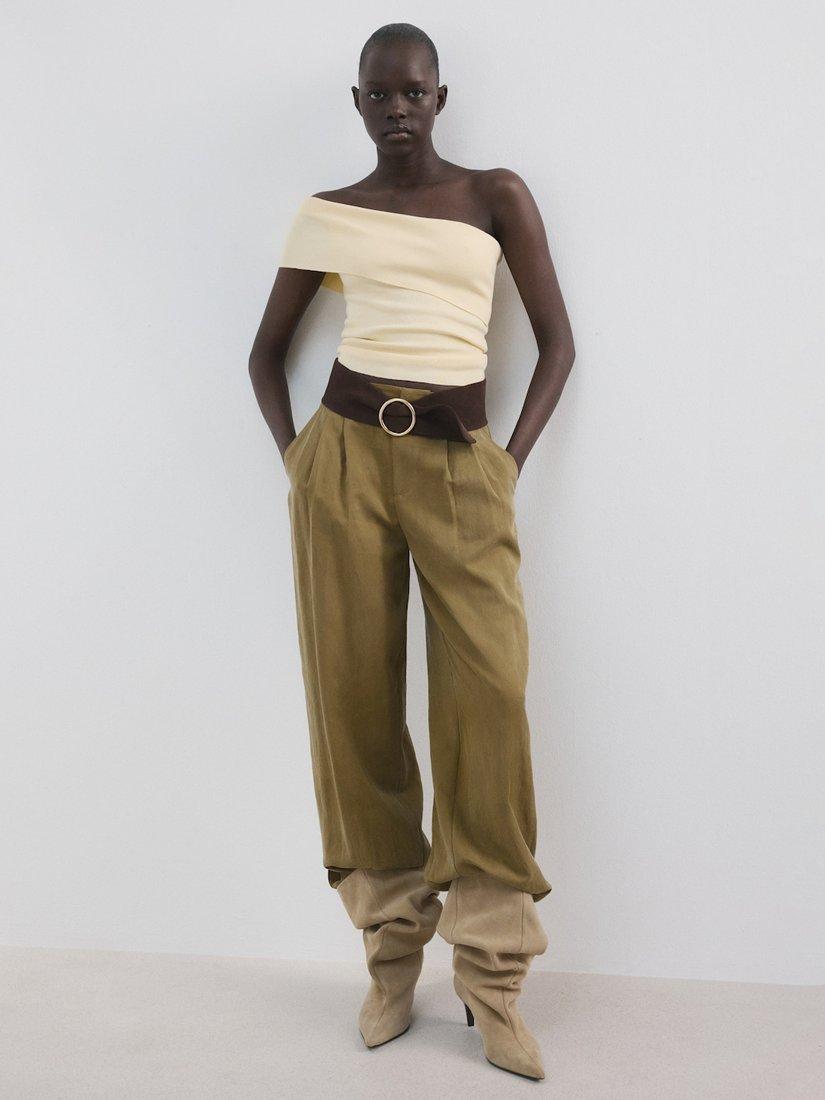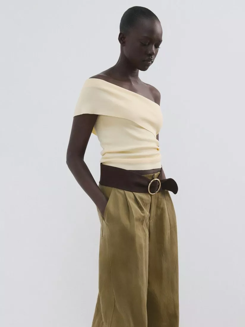 An off-shoulder neck gives this viscose-blend tank a sharp finish, while the slim cut keeps things light for daytime dressing or layering when the temperature dips.