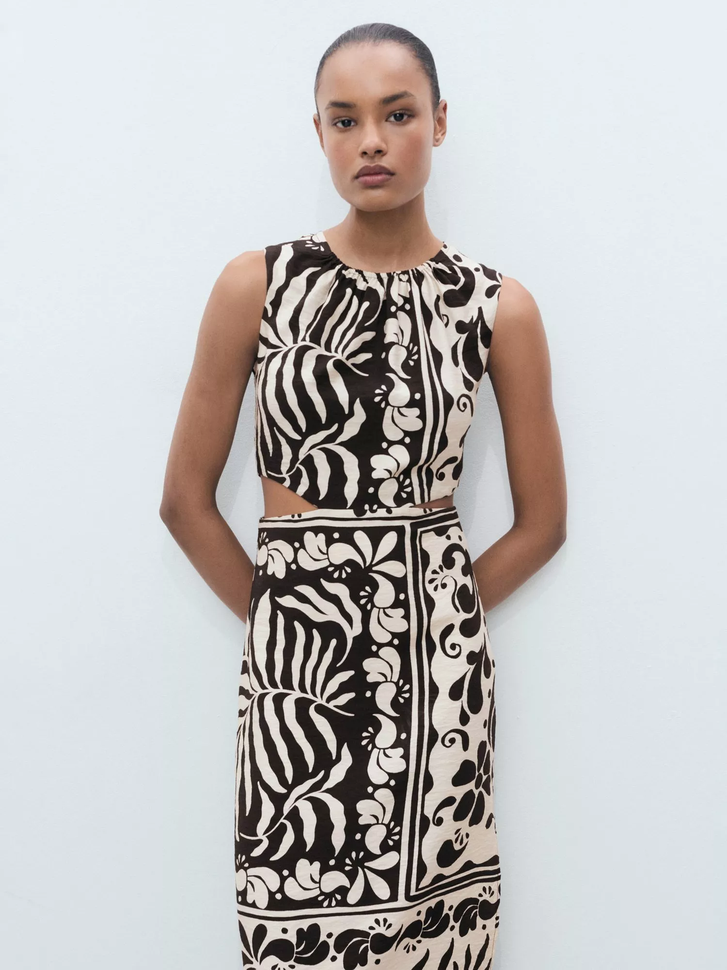 With a gathered round neckline and cut outs at the waist, this straight midi dress from Mango is made from a whisper-weight viscose blend.