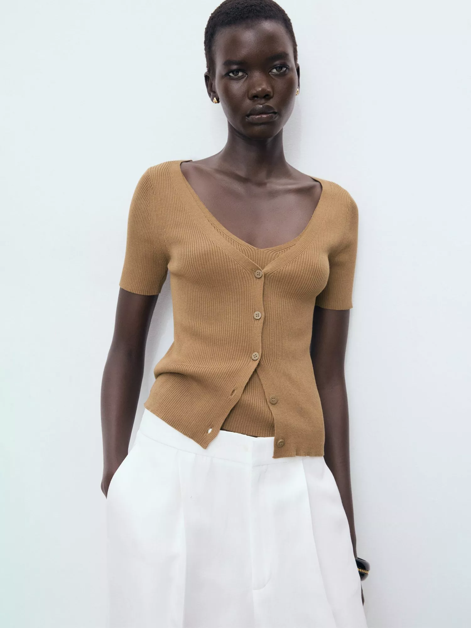 The short sleeves of this cardigan keep you cool, while the soft cotton blend feels good all day. With a v-neck, clever button fastenings add a touch of interest to any outfit.