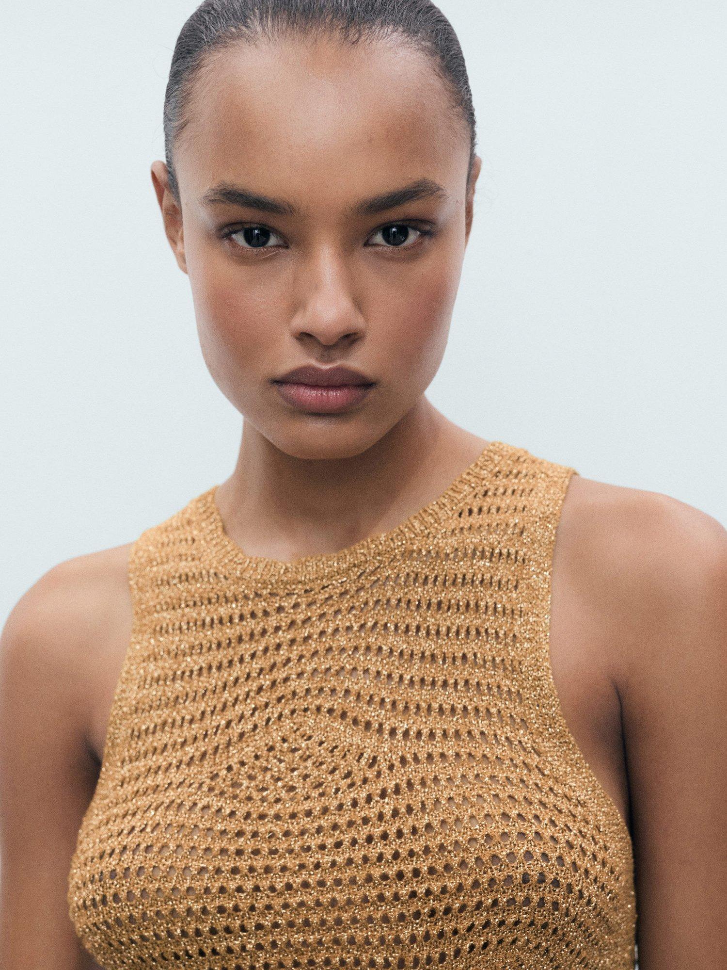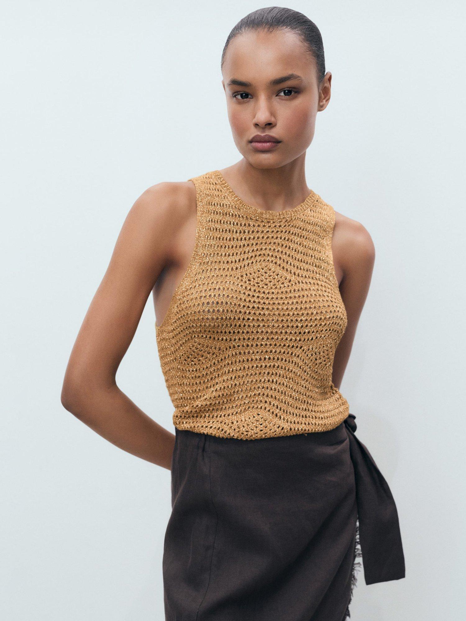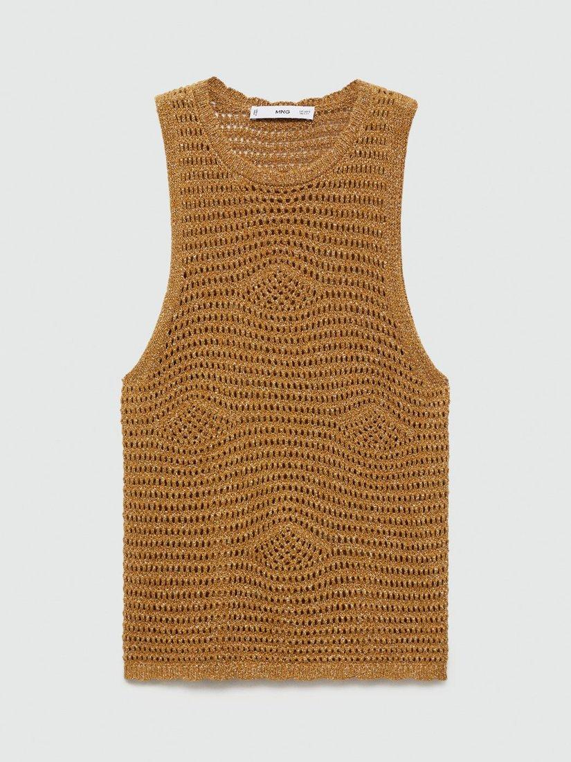Mango’s sleeveless open knit tank top shines with a subtle metallic finish, adding energy to your everyday style. The soft viscose blend feels great all day, while the round neck keeps it effortlessly smart.