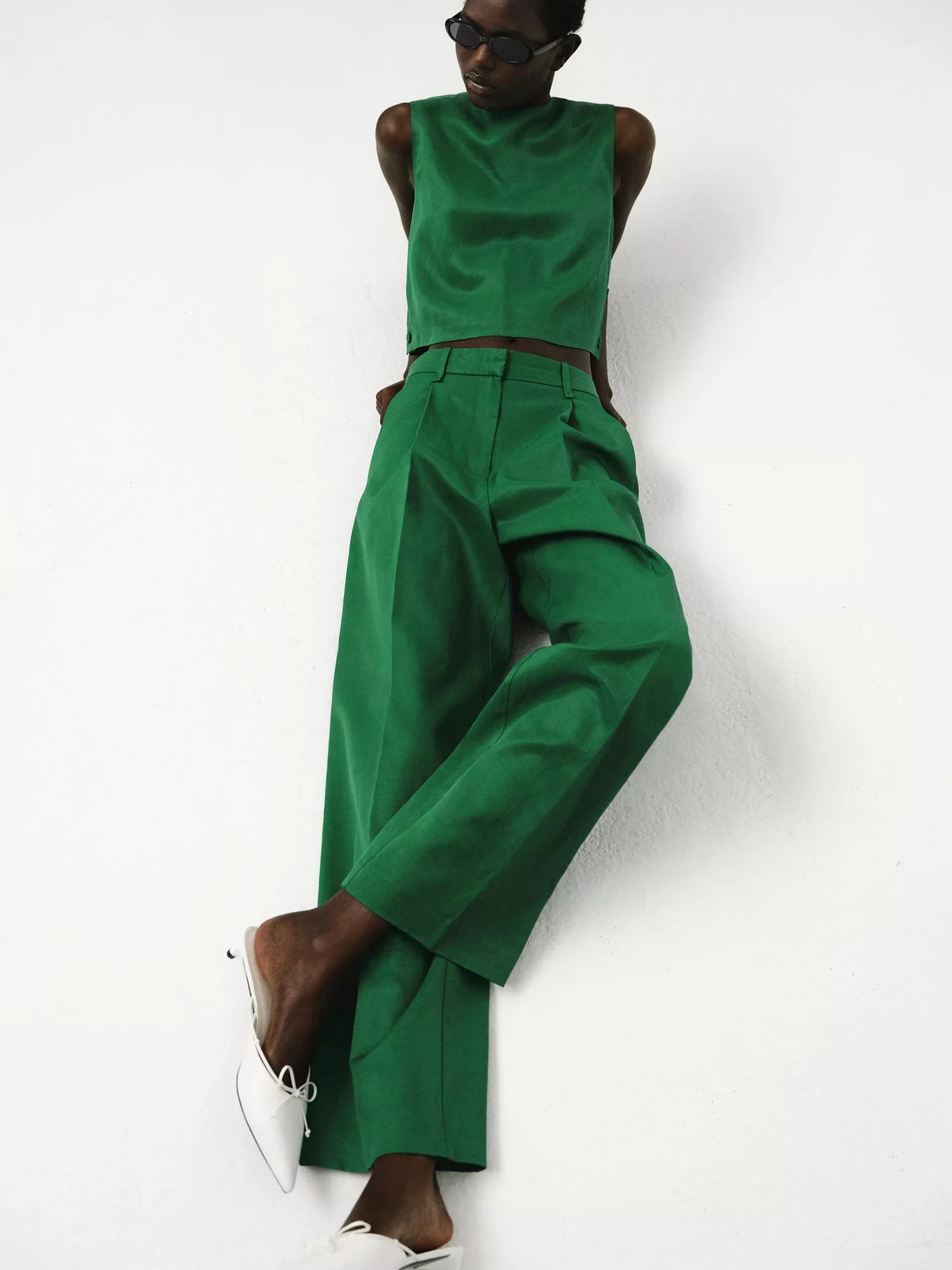 Straight leg trousers by Mango, crafted from a linen-blend with a soft satin finish. They sit mid rise with a zip fly and a regular length.