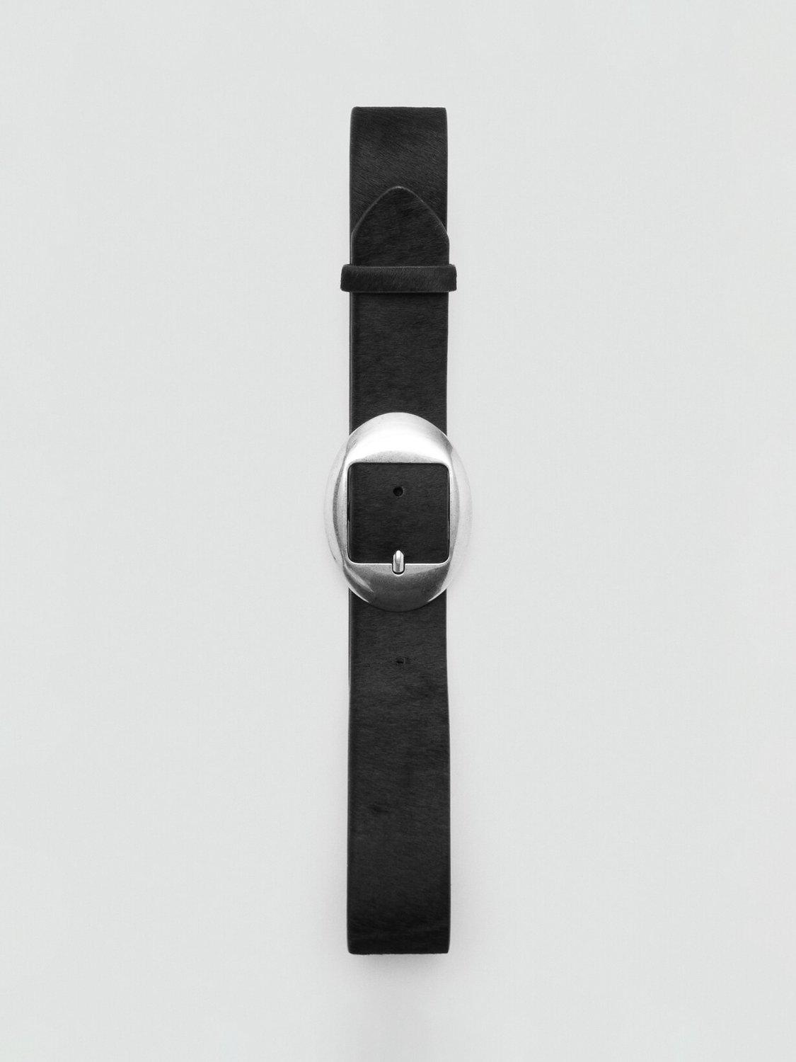 Supple leather belt featuring an artisan oval buckle, offering sculpted silhouette and tactile luxury for weekend and evening looks.