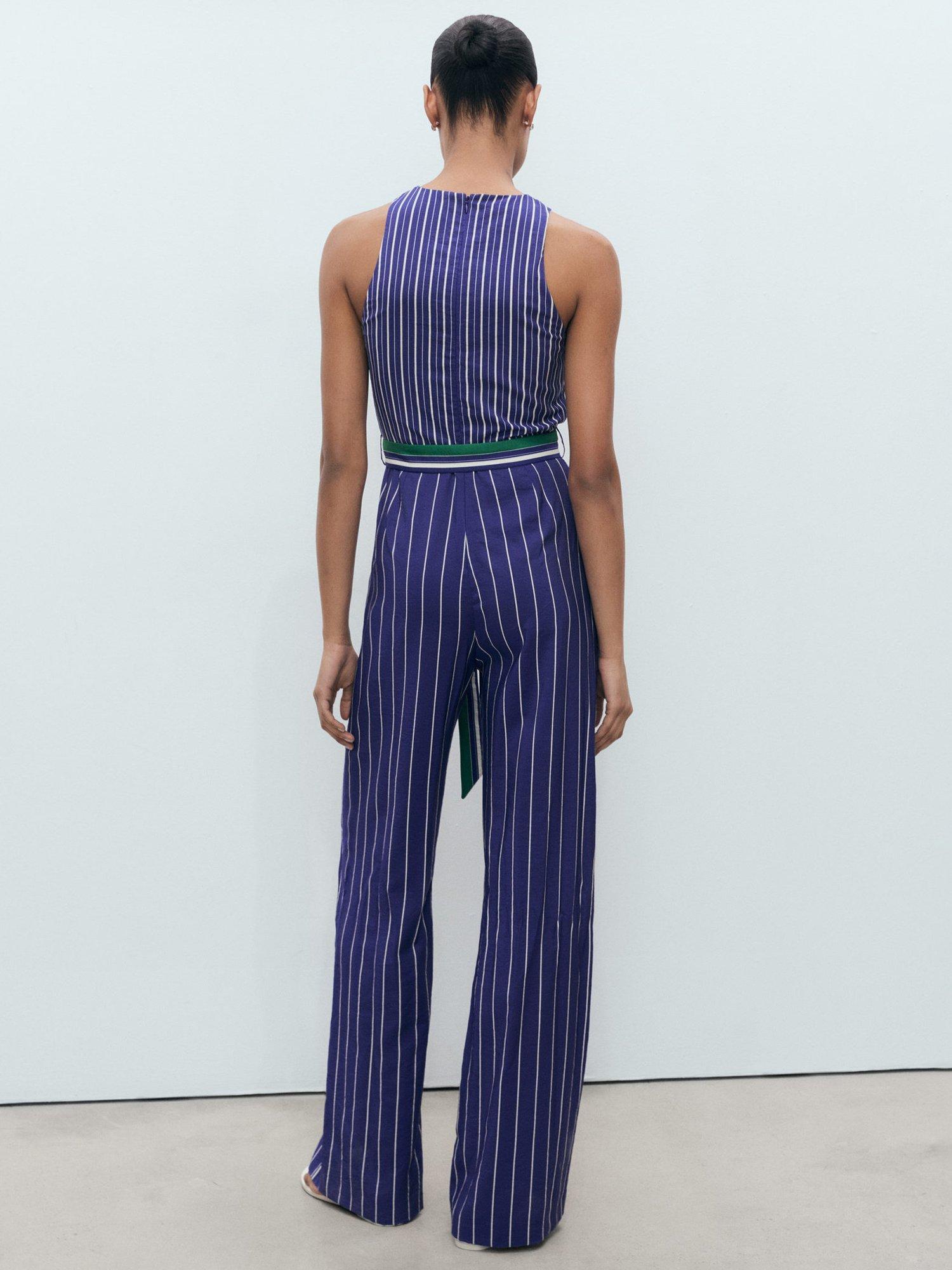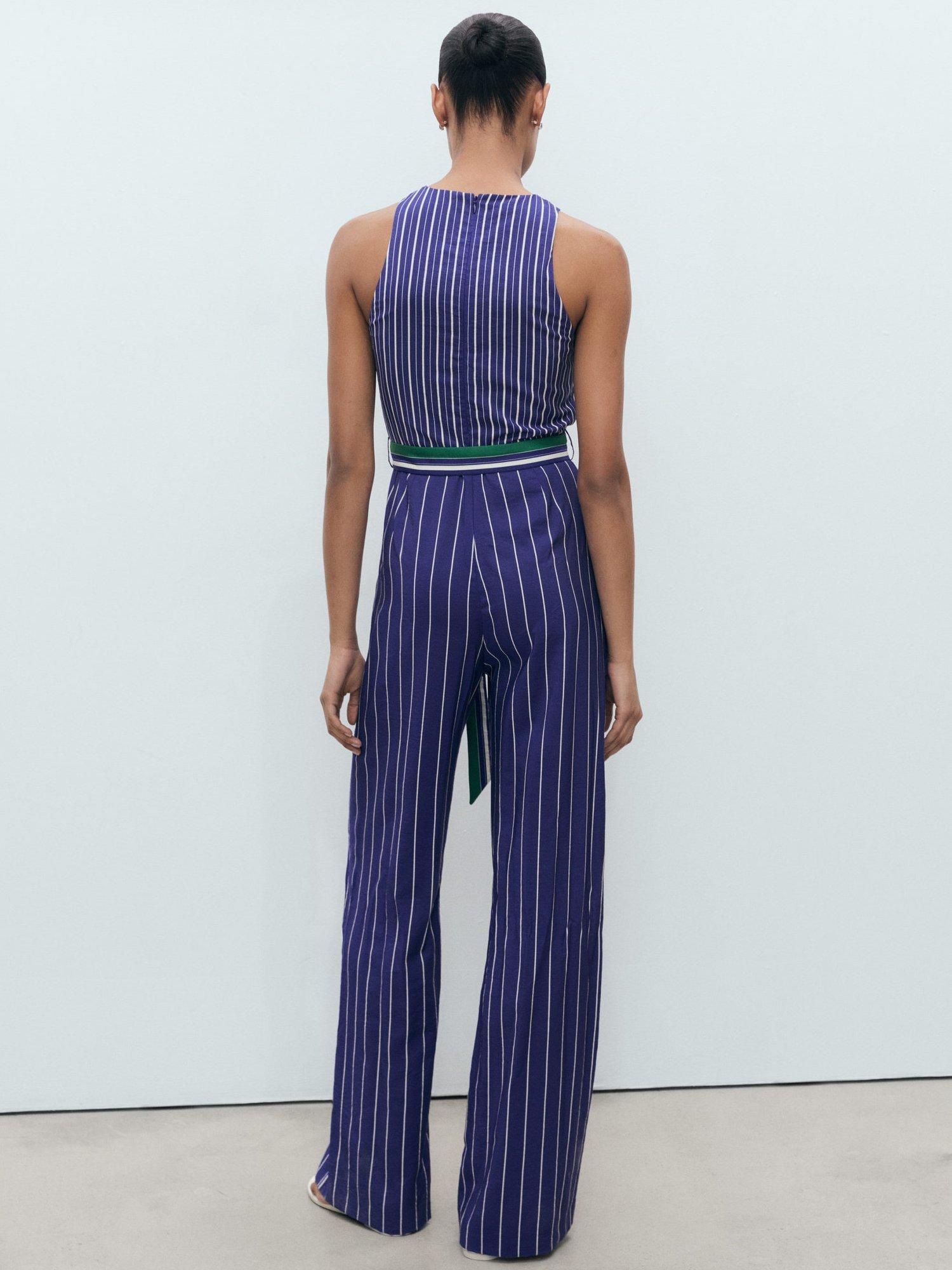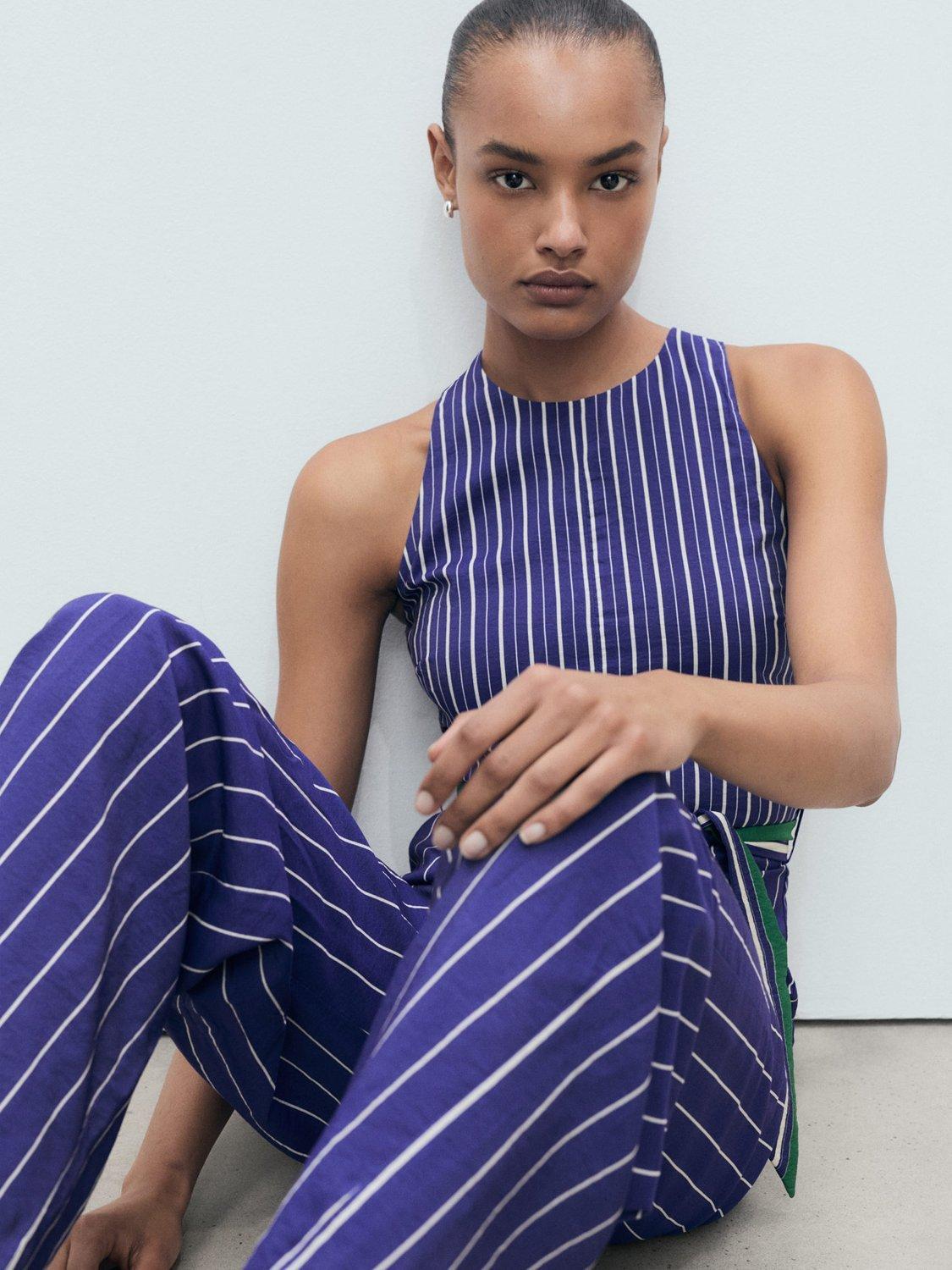 Mango’s striped sleeveless jumpsuit balances smart design with easy charm. Its soft viscose blend moves with your day, while subtle stripes and a contrast self-tie belt add personality. Perfect for those who enjoy their style with an eye for the interesting.