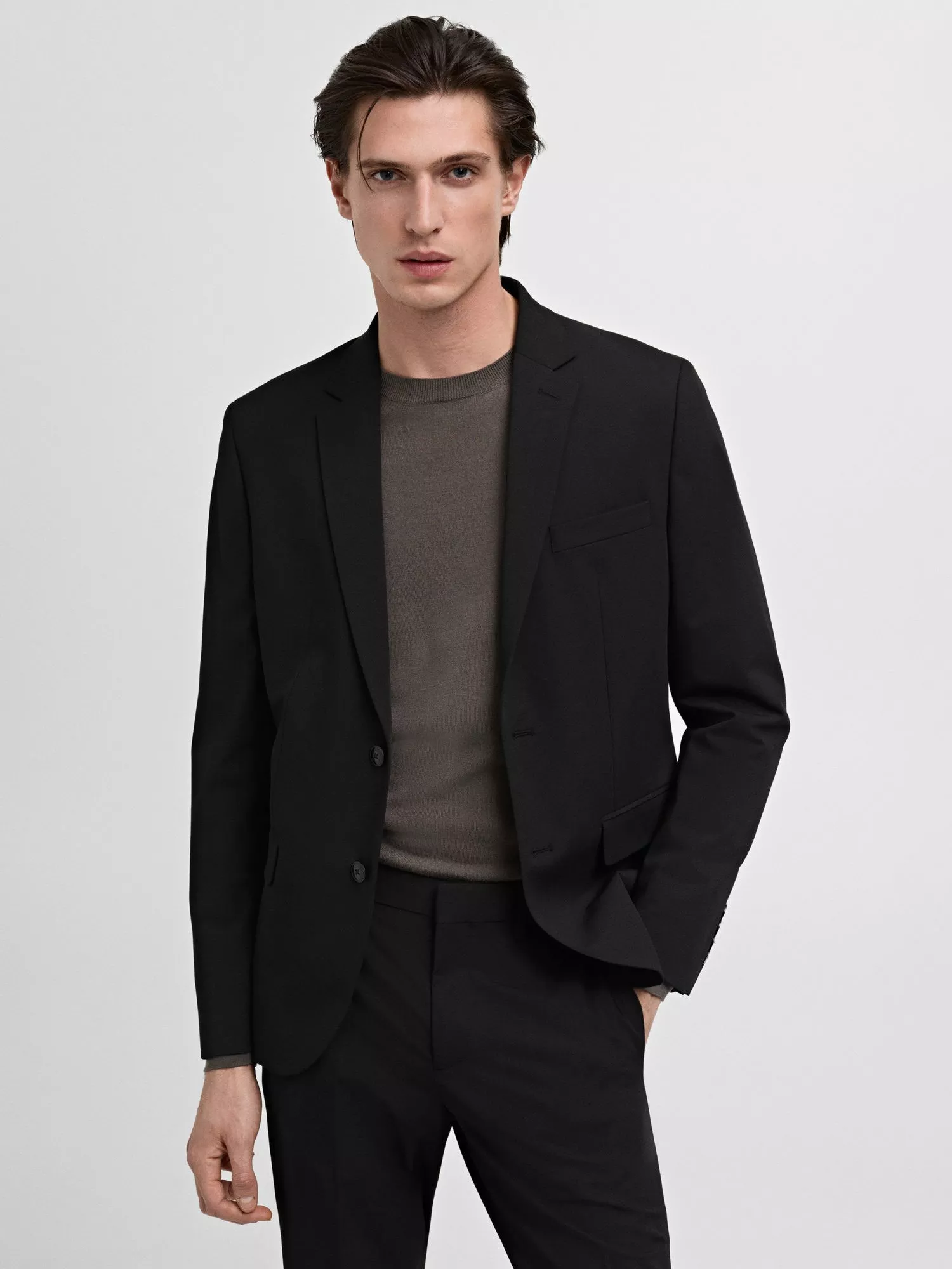 Mango's Paris blazer has a super-slim fit, a window frame print and a lapel collar. It's finessed with a welt pocket at the chest, two welt and flap pockets on the front, and inner lining.
