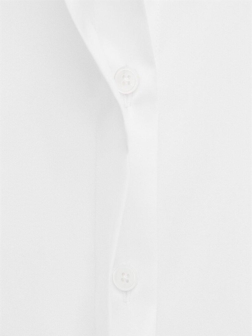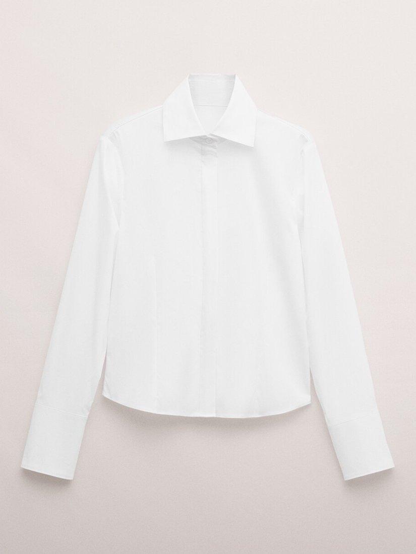 A tailored shirt in a soft cotton blend with stretch. Features a classic collar, long sleeves with buttoned cuffs, and a hidden front button placket for a clean, polished look.