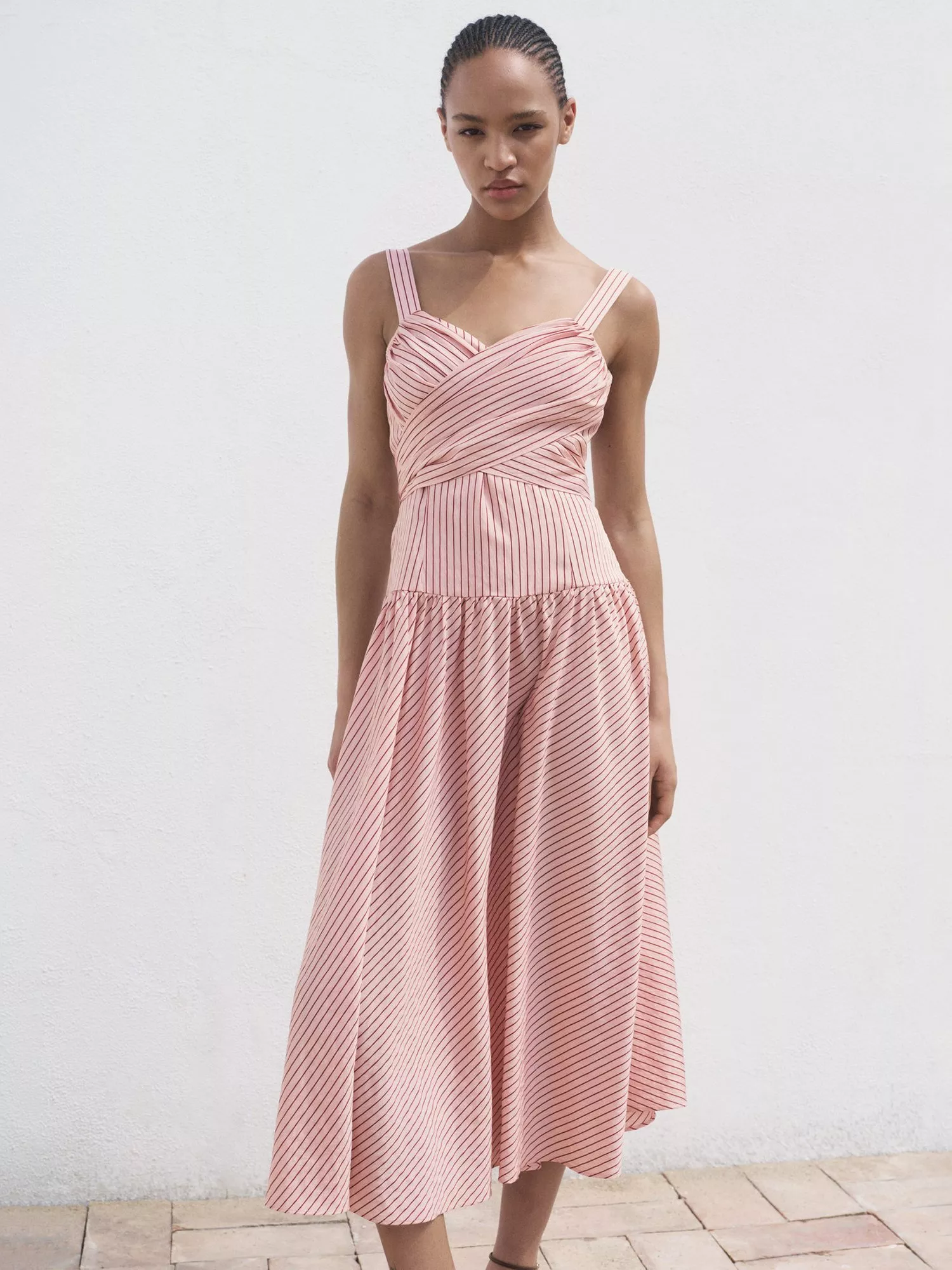 A midi dress, featuring a flattering crossover fit, playful stripes, and a soft sweetheart neckline. Light spaghetti straps keep you cool and confident for any sunny day out or summer plans.