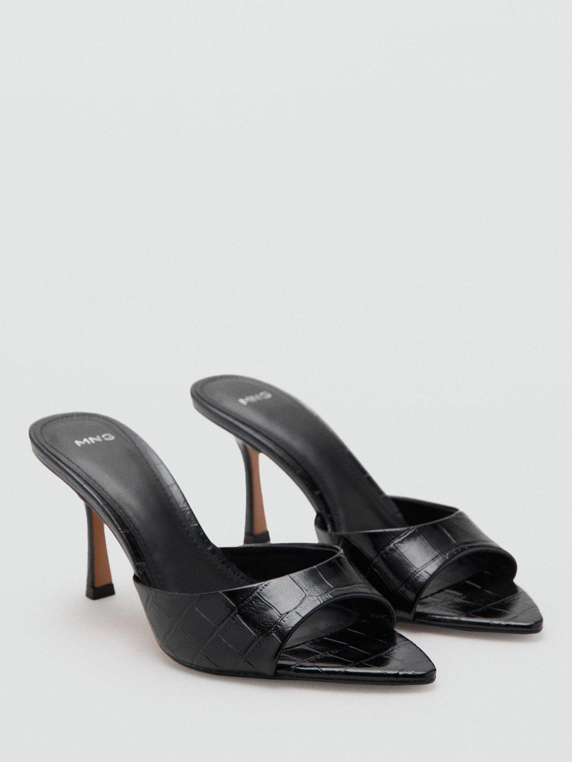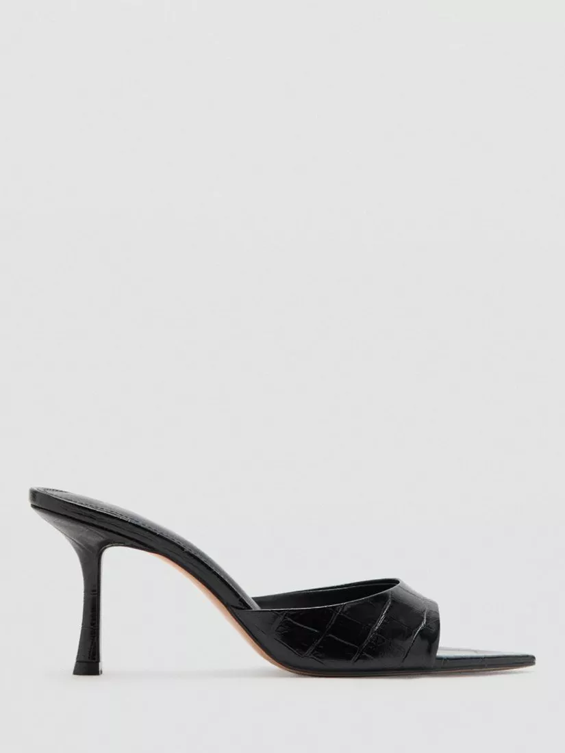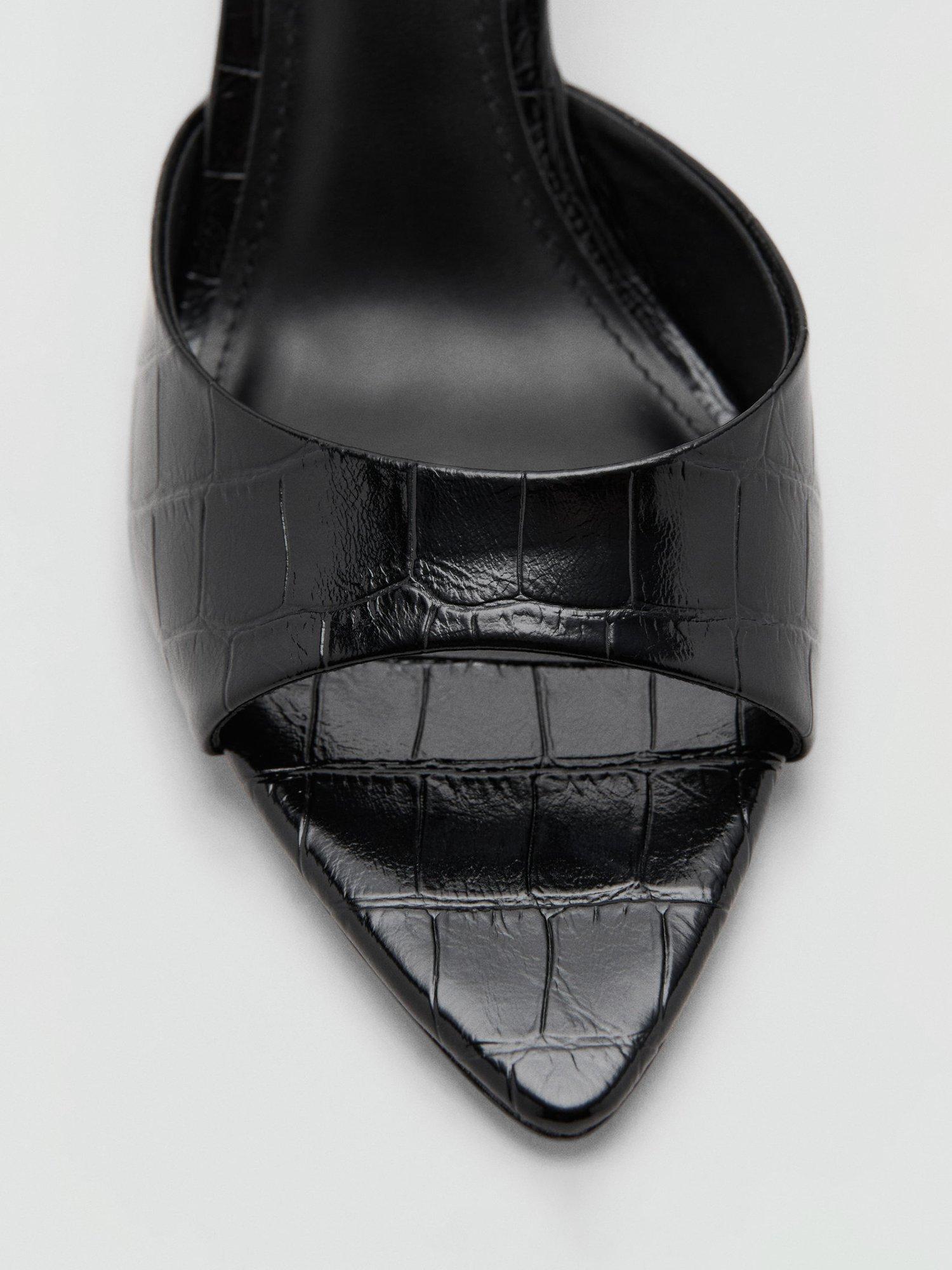 Mango heeled mules with a textured croc-effect finish and an elegant pointed open toe, balanced atop an 8cm stiletto heel for confidence. Slip them on easily for a striking occasion look.