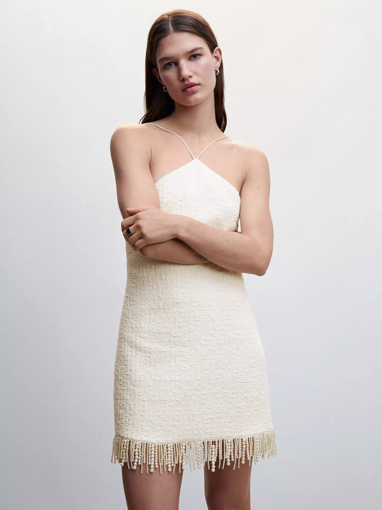 Designed in a simple but effective straight shape, this mini dress from Mango is rendered in a cotton blend. With a neat halter neck, this sleeveless style boasts pearl-effect fringe embellishment which transforms a simple design into a stand out.